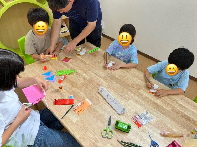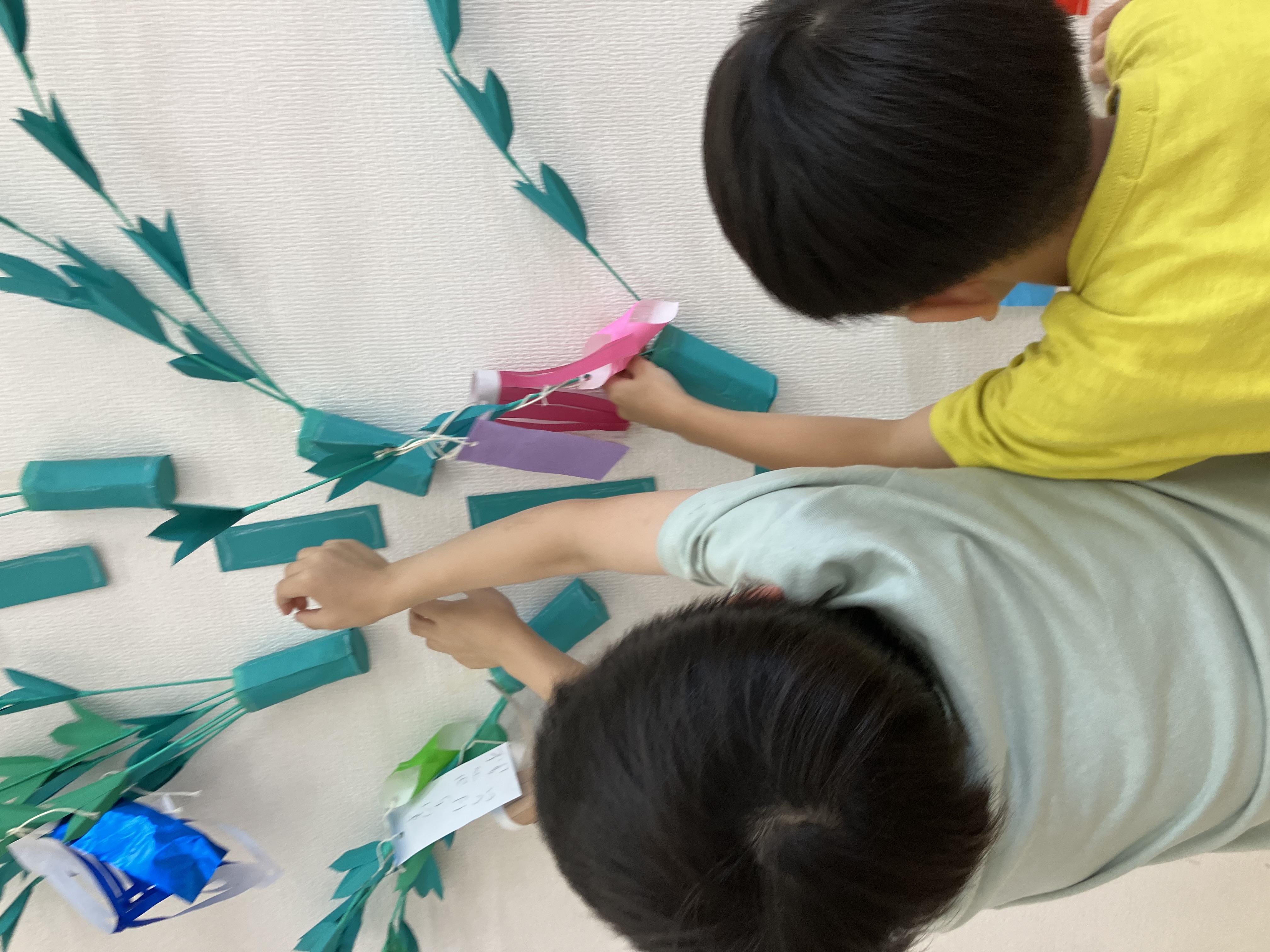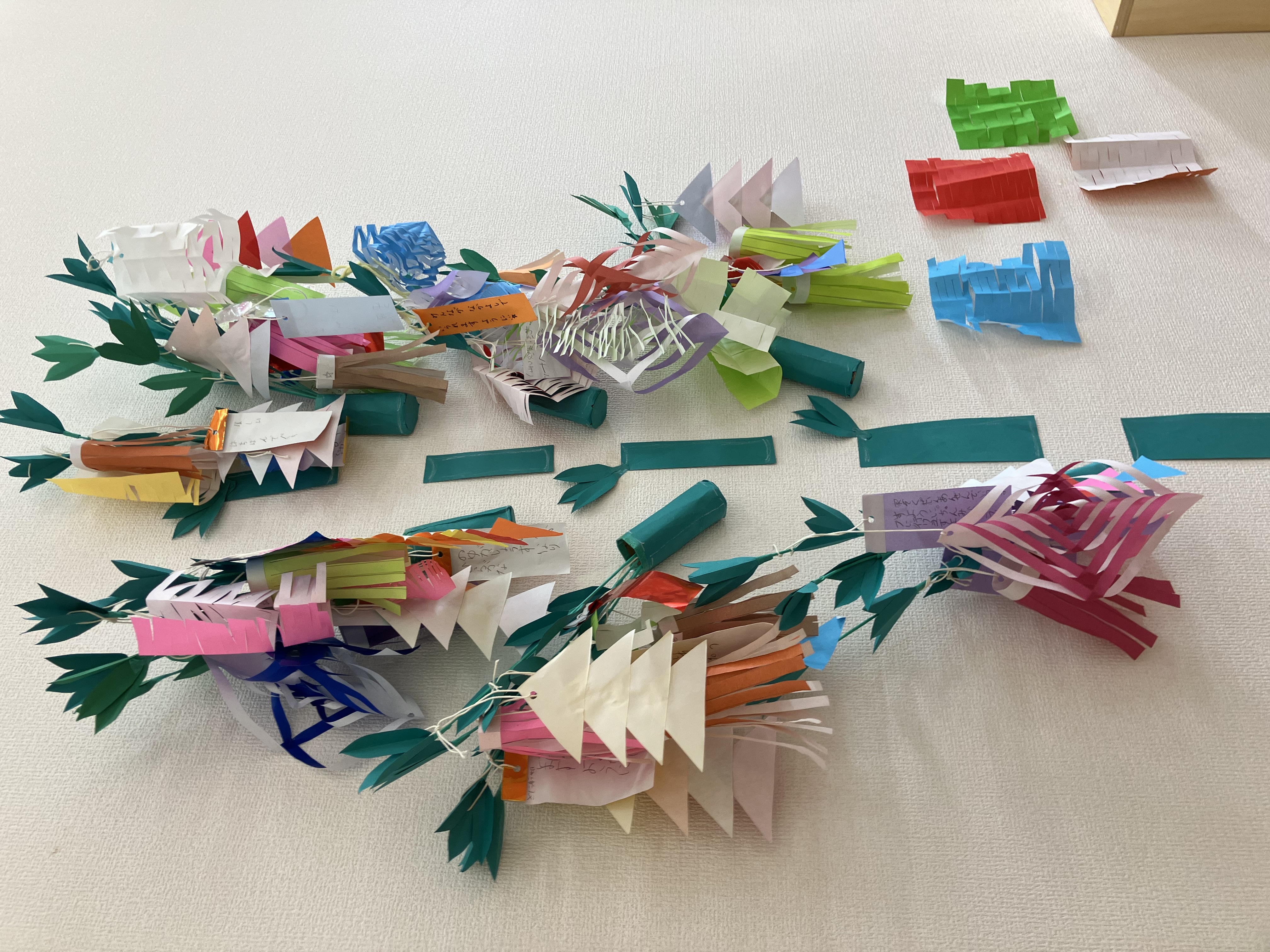 短冊に願い事を書き、ハサミやノリを使って飾りを作ると、あっという間に壁が華やかになりました🙌