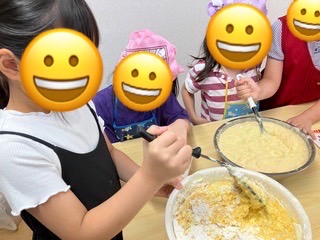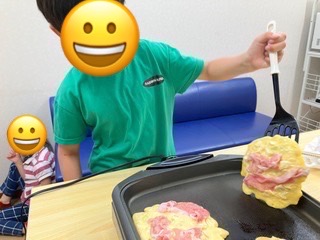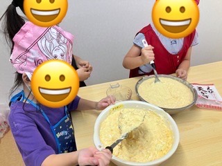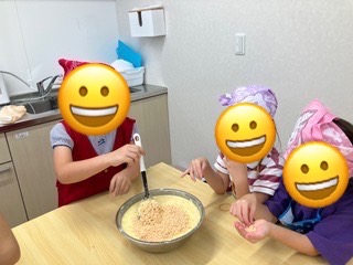 生地作り担当では、卵や揚げ玉を入れ生地を作り、全員分を一気に作ったのでボウルに溢れるぐらい一杯になり、皆「溢れる溢れる!」と言いながらも上手に混ぜ合わせていました😆また、つまみ食いした揚げ玉は格別に美味しかったようです😋