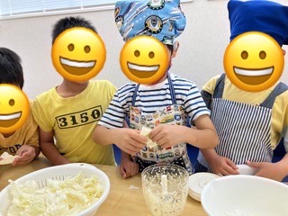 ブンブンチョッパーでキャベツを切る所から始め、生地作り、焼き、お片付け等一連の流れを行いました🧑🍳