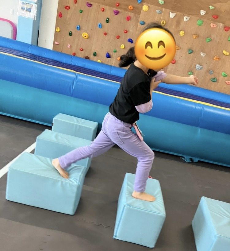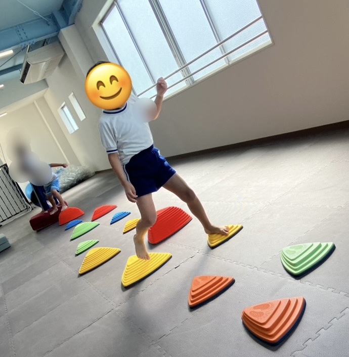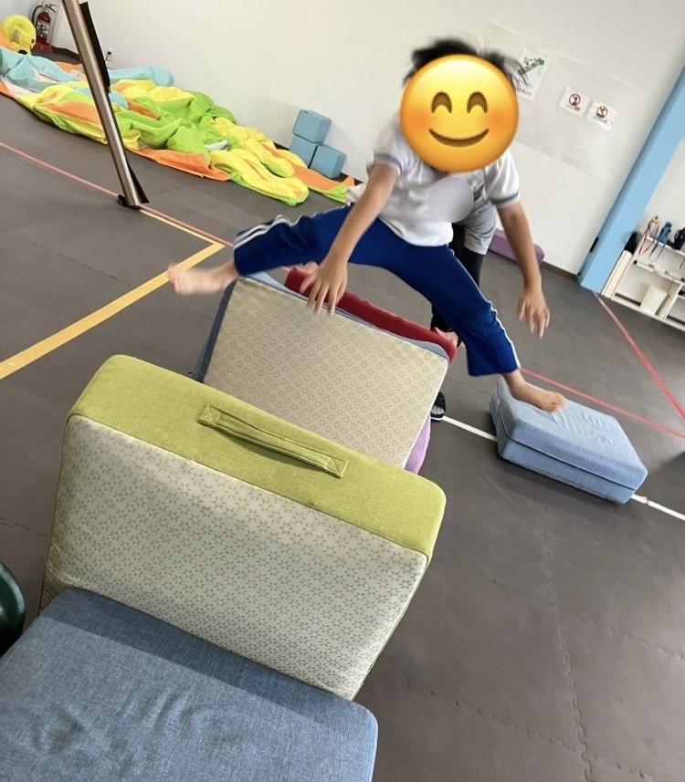 バランスストーンやクッションから落ちないように慎重に歩き、滑り台を滑り、立ててあるクッションを大ジャンプで飛び越えたり、跨いだりとたくさんの動きを1つのサーキットで行いましたよ🛝