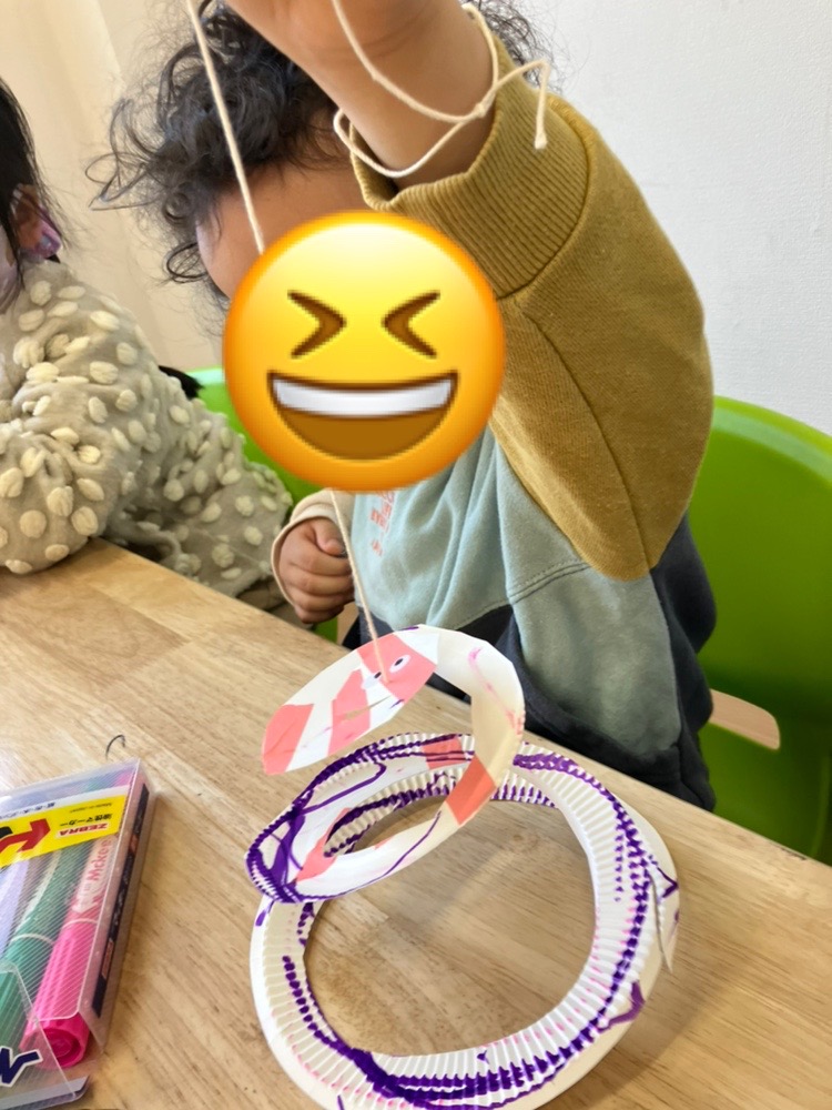 紙皿に紙テープやペンで装飾をしてハサミで丸く切り、紐を着けるとヘビの完成です❕