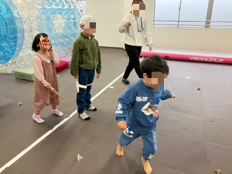 放課後デイサービスの小学生が鬼役をしてくれ、「おにはそと ふくはうち!」と大きな声で言いながら豆を投げる事が出来ました🙌🏻