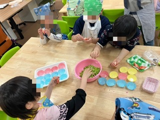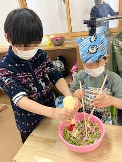 お弁当作りでは無限ピーマン、カニカマ枝豆サラダ、ミニアメリカンドッグ、ハムチーズを作る4チームに分かれ、取り組みました!