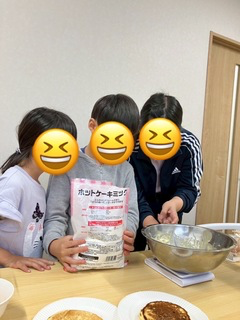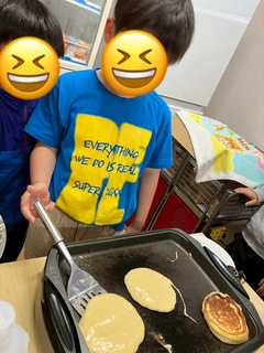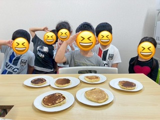 自分たちで卵の殻割り🥚や粉混ぜから始めて、生地を焼き、まん丸ホットケーキの完成です😋