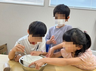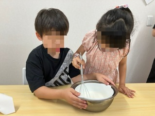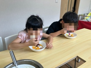 本日はプリンアラモード作りという事でプッチンプリンの上にみんなで泡立てた生クリーム、果物をトッピングしました!
