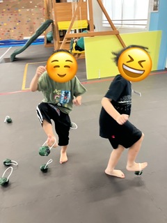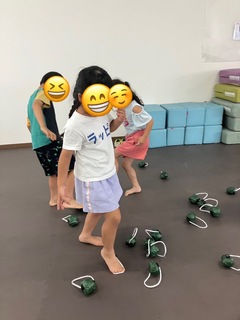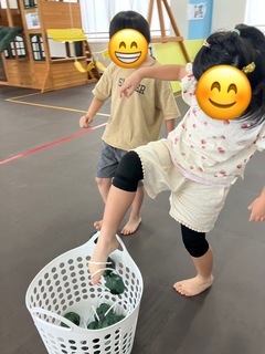 本日は「足を使って運動しよう」ということで、紐をつけたボールを使って活動をしております🎾バランス感覚や体幹を鍛えることを目的として、足先に紐をひっかけ、片足跳びでボールをカゴまで運びました💪2チームに分かれてどっちが多くのボールをカゴに入れられるか対決をし、白熱した戦いになりましたよ🔥片足跳びに苦戦する様子も見られましたが、足を沢山使って楽しんで活動されていました☺️🦵