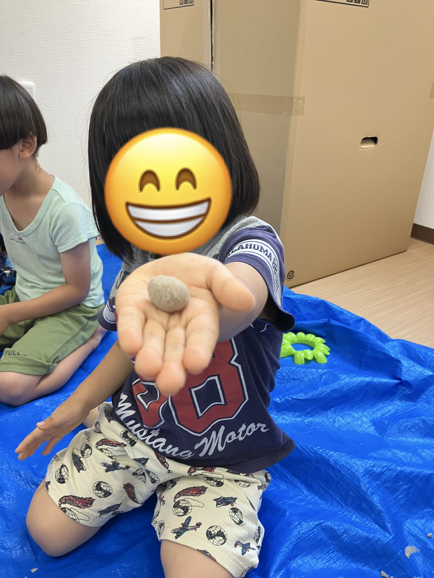 固まるけどベタつかない新感覚の砂を丸たり型取ったりして思い思いに取り組んでいます♫