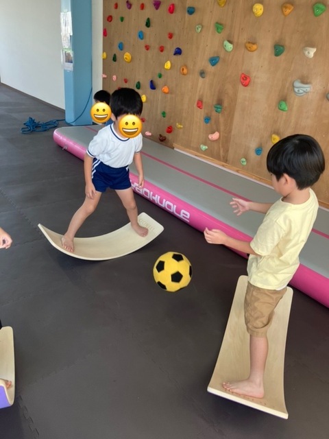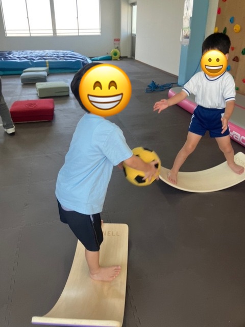 ボードの上でバランスをとりながら、相手が取りやすいようにボールを投げるといった2つの集中力が必要になる活動です🎾