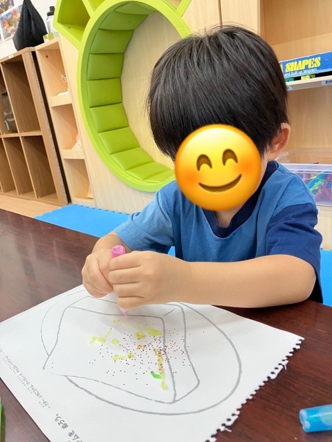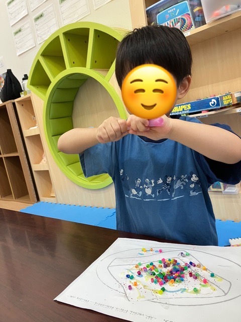本日の児童発達支援では、パンのイラストにキラキラのりやラメで飾り付けをしました!