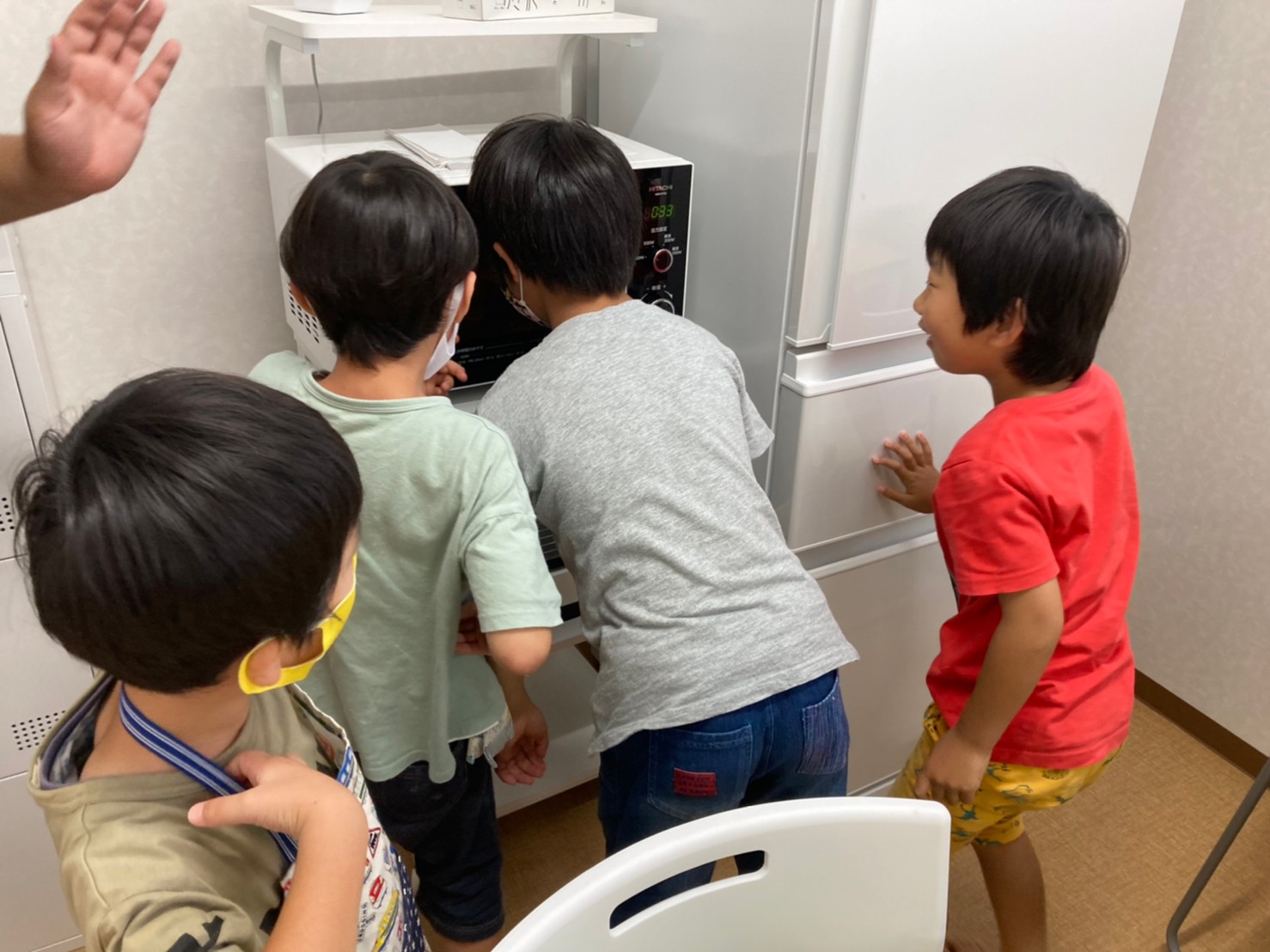 レンチンを待つ間も「うわぁ❗️膨れてきたよー‼️」と大盛り上がりの子どもたちでした