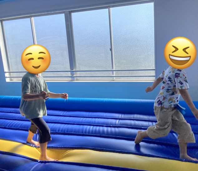 走るも良し! 寝転がるも良し! 当然、飛び跳ねるも良し!! 大人も遊べる仕様なので、職員が飛び跳ねた弾みを全身で感じて楽しんでいる子も居ます😊