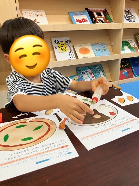 エビフライやハンバーグ、ハムといった具材を点線に沿って切り取り、ノリをつかってピザ生地やカレーライスが描かれた台紙に貼り付けて楽しんでいます🍕🍛