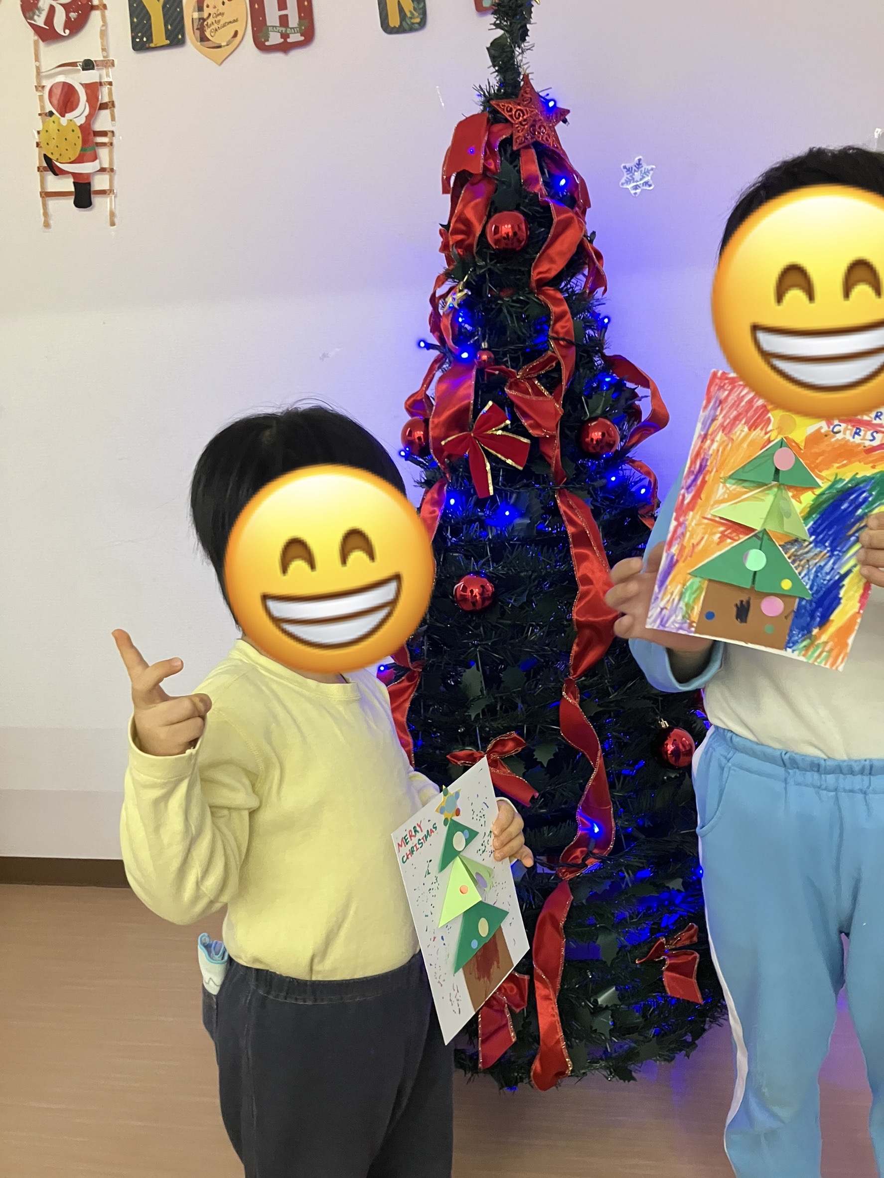 立体的なクリスマスツリーが完成し、笑顔で記念撮影をしています🎄✨
