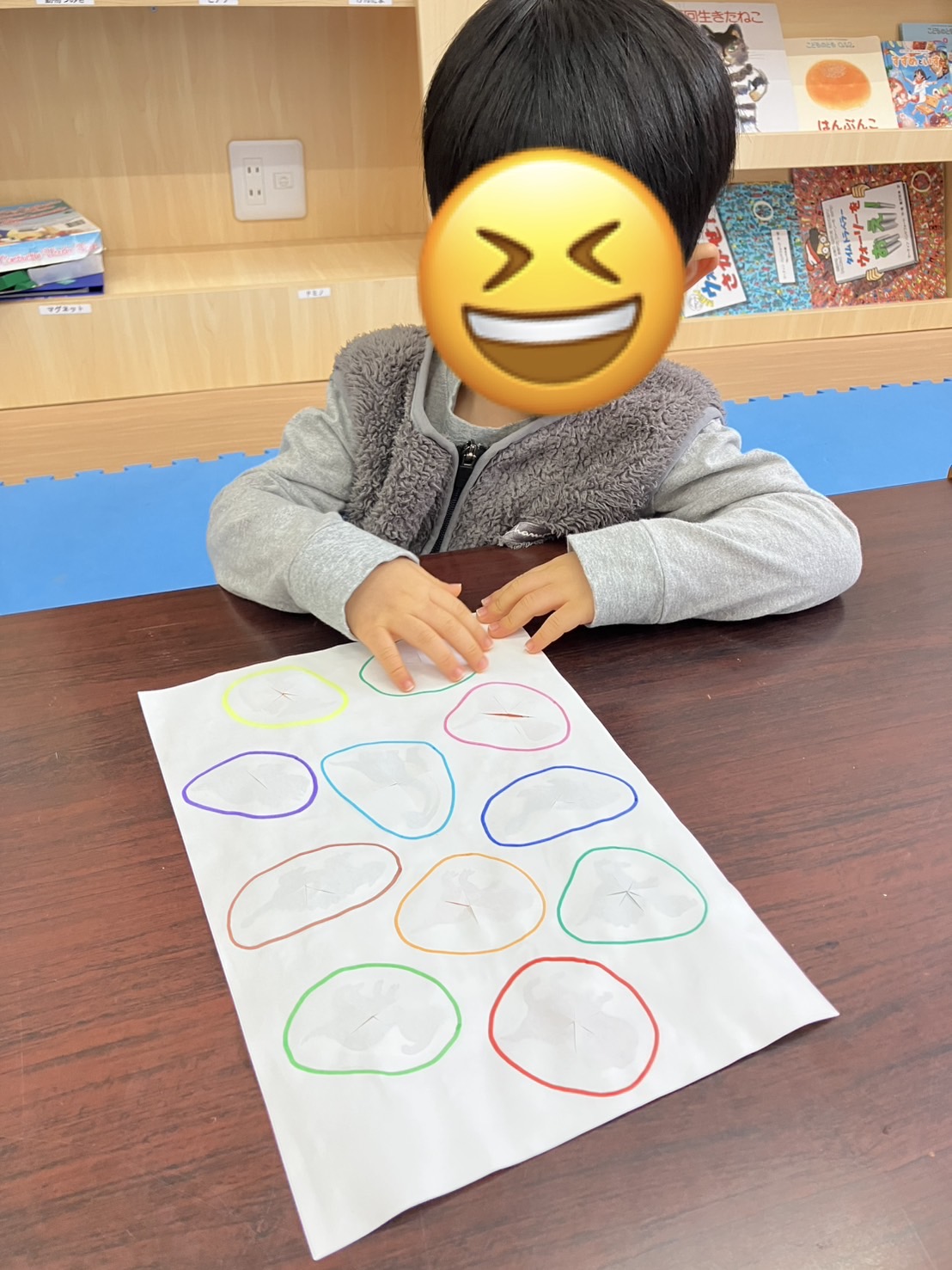 たまごの中の恐竜を見るために、上手に指先を使って破ることができていました💪