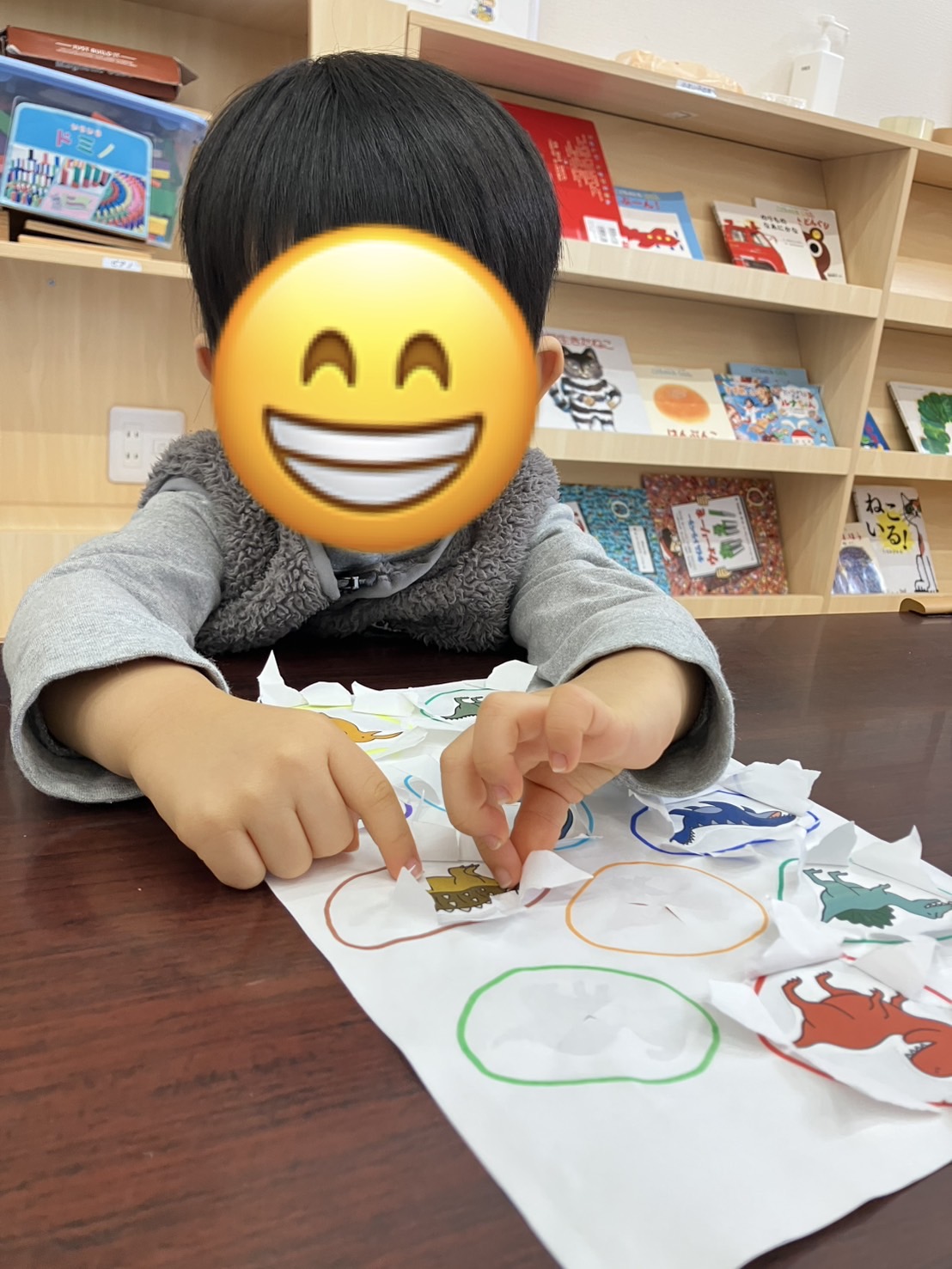 本日の児童発達支援では、指先の巧緻性や集中力を高めることを目的として卵の殻に見立てた紙をビリビリ破いていく活動を行っております🦖