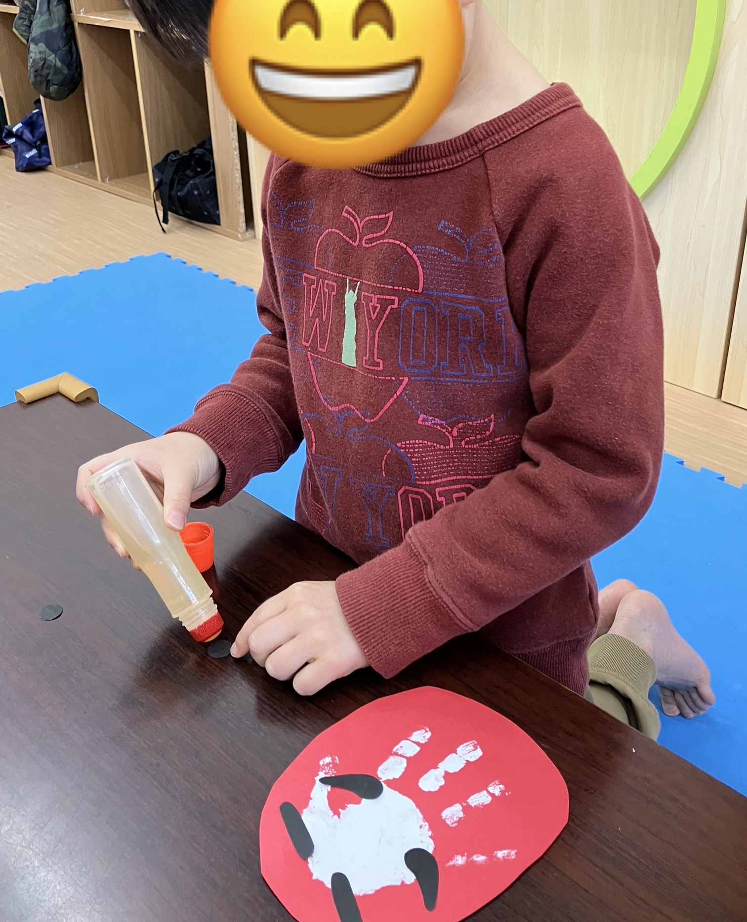 絵の具を手に塗ると、少し不思議そうな表情を見せながらも、画用紙に元気よく「ペッタン!」と手形を押すことができました✨