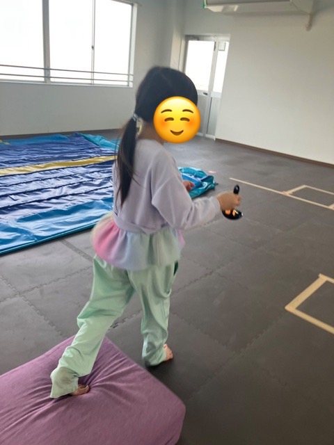 テープの上や感覚の空いたクッション、竹の上から床に落ちないように慎重に歩いてコースを回ることが出来ていましたよ!🚶