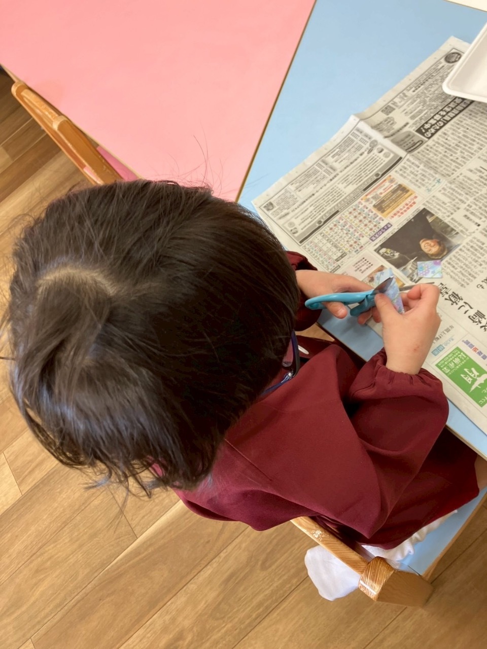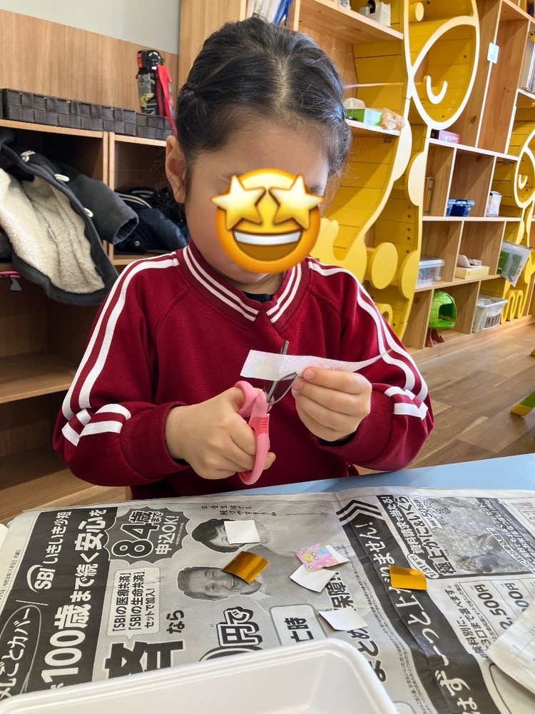 ハサミは正しい持ち方で丁寧に丁寧に…見本の大きさと見比べながら上手に切ることができ、糊の量もパーツの大きさに合わせて調節しながら貼ることが出来ました👏✨