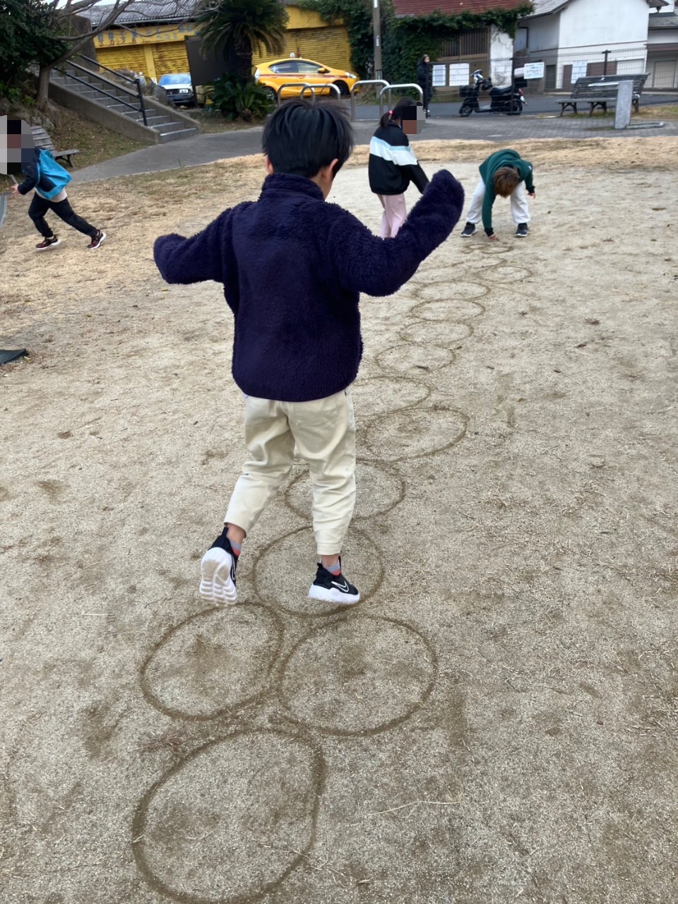 地面に丸を描いて、ケンパ遊びをするお友だちもいました😀