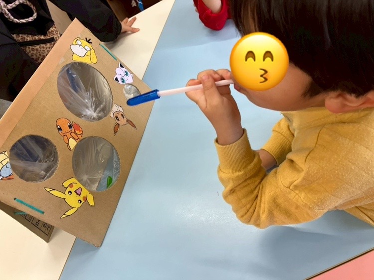 ストローに鉛筆のキャップを被せ、吹き矢のようにして異なる大きさの的に吹いてもらいました👄