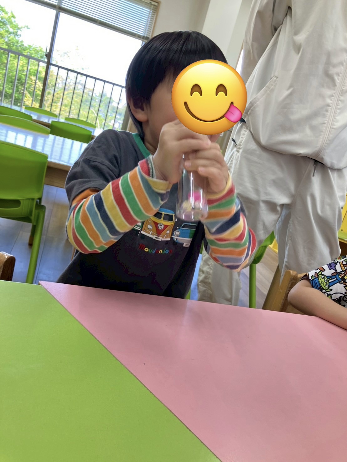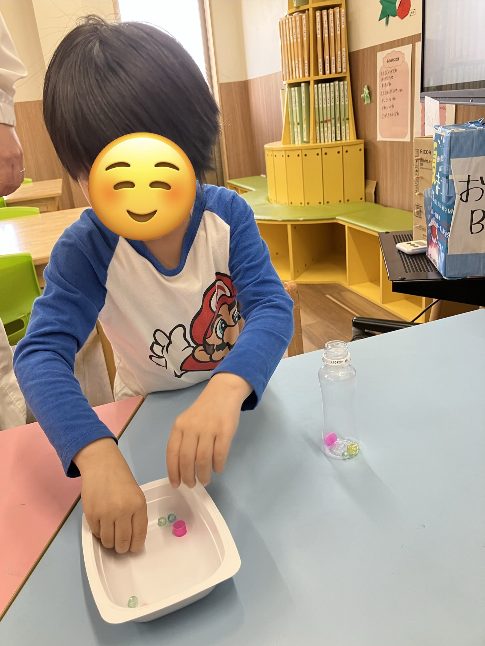 あじさい愛宕です🍀 今日の児発のお友だちは音楽あそびでした🎶 小さなペットボトルにカラフルなビーズを入れて「マラカス」を作りました🪇 振るとカラカラ音がなり手作り楽器の完成です✨️