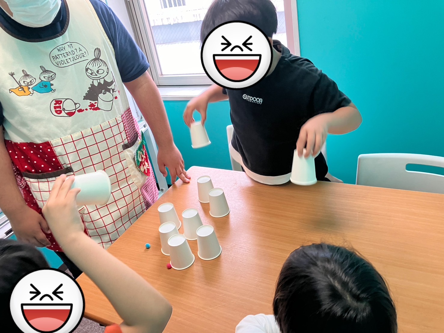 どのカップに入っているのか当てるゲームで、物を捉える力や追う力など眼球運動の一環として行いました。 レベル①からレベル③まで用意し、レベルが上がるごとにシャッフルするスピードやボールの数を増やしてみました! 1人でチャレンジする子もいれば、チームで協力して行う子どもたちもいたりと、それぞれに合った取り組みで集中して取り組むことができていました。