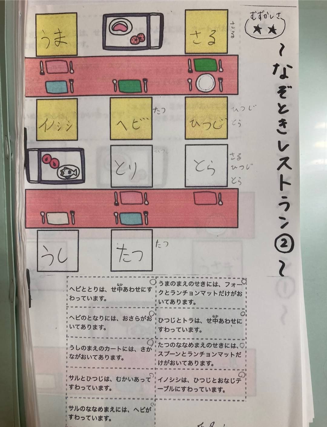 複数の文章を読み、誰がどの席に座っているか当ててもらう謎解き形式の言語訓練です⭐️