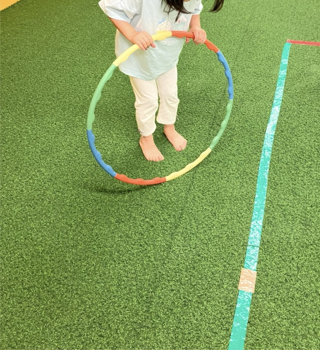 本日の活動は「フラフープくぐりゲーム」を行いました🌈感覚統合療法の一種でバランスよく身体を動かす能力を養う目的で行いました✨フラフープを両手で持ち、その動きに合わせて体幹や足を頑張って合わせていました😊