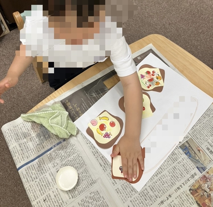 そのパンの上に自分たちで好きな具材やフルーツを乗せて最後をパンどろぼうを付けると完成です🍞