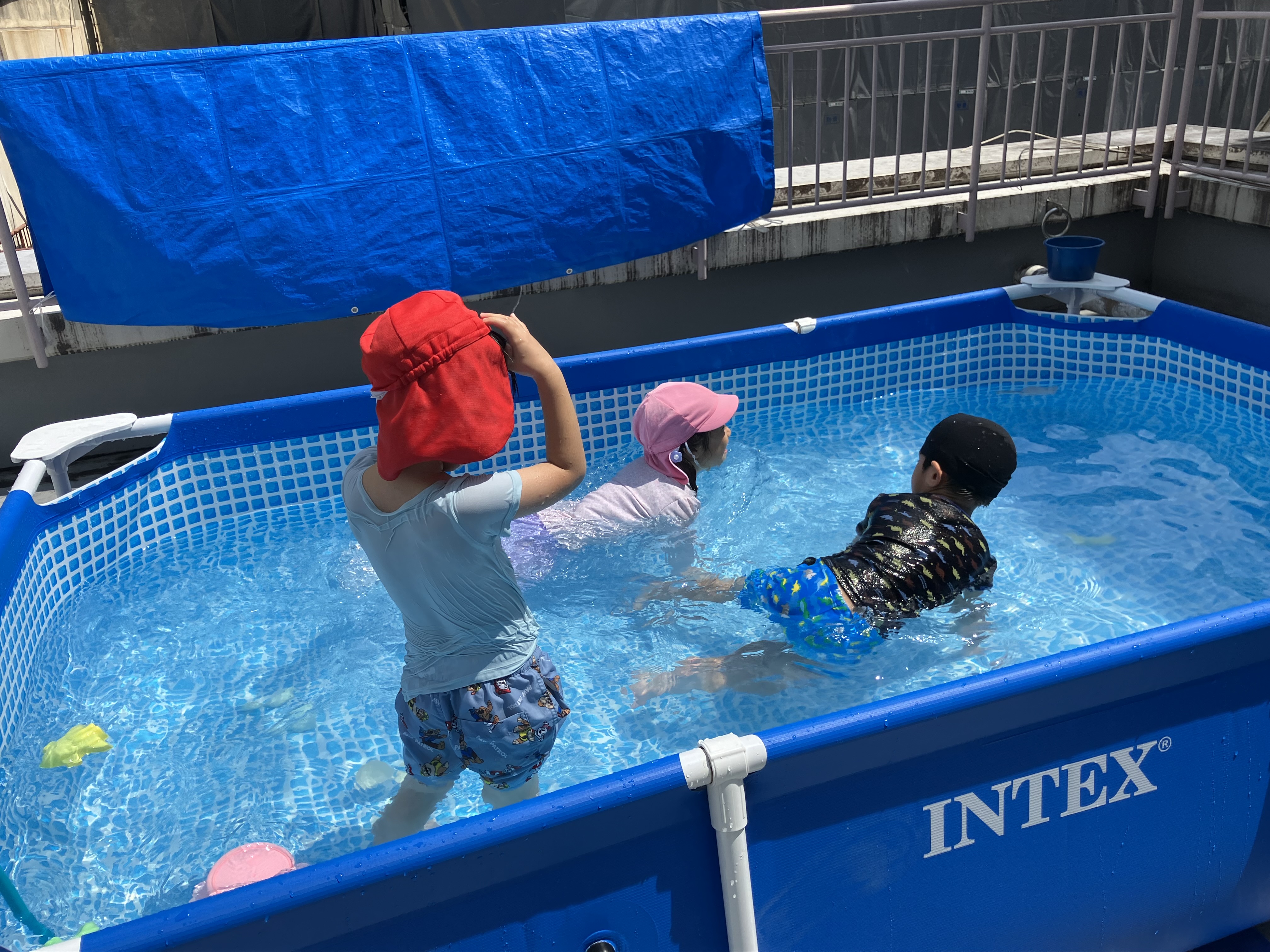 「楽しい~」「気持ちいい~」とそれぞれに言っていました⭐️水鉄砲で水を飛ばしたり、水の中にある玩具を集めたりと、お友達と一緒に楽しんでいました😊