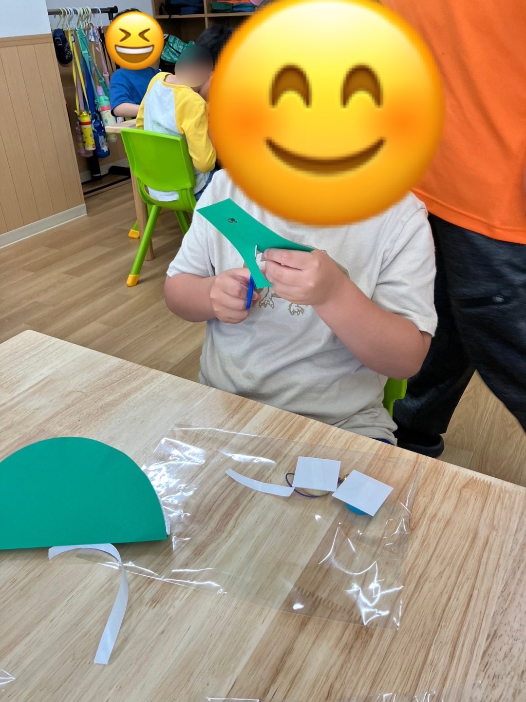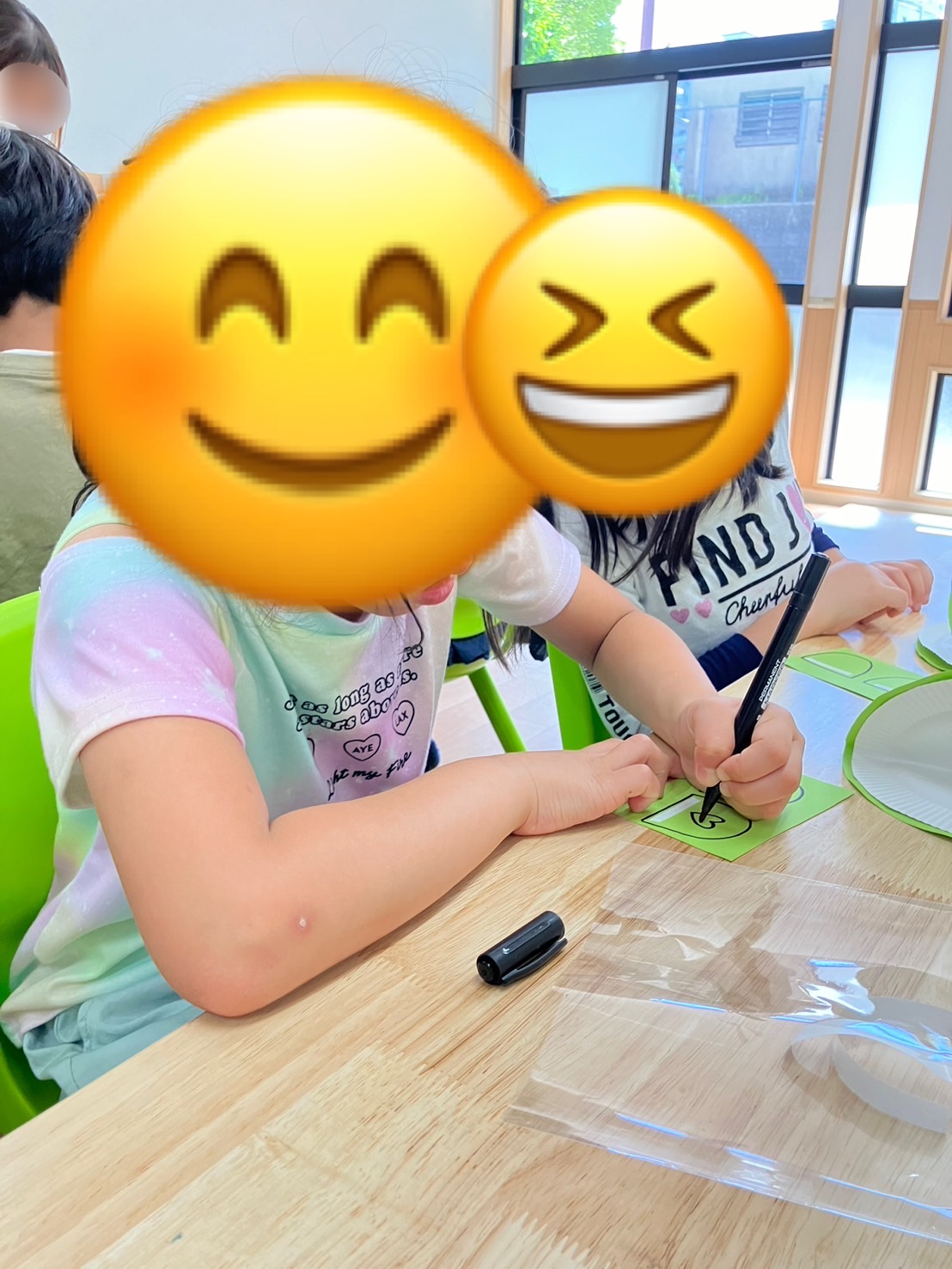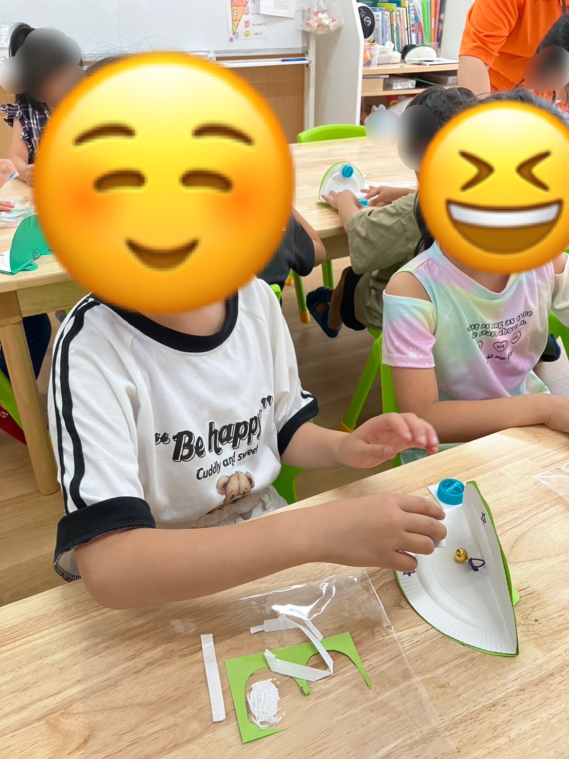 紙皿や画用紙、ペットボトルのフタを使い、目や口を自分たちで描きそれぞれ可愛いカスタネットが出来ました🎵