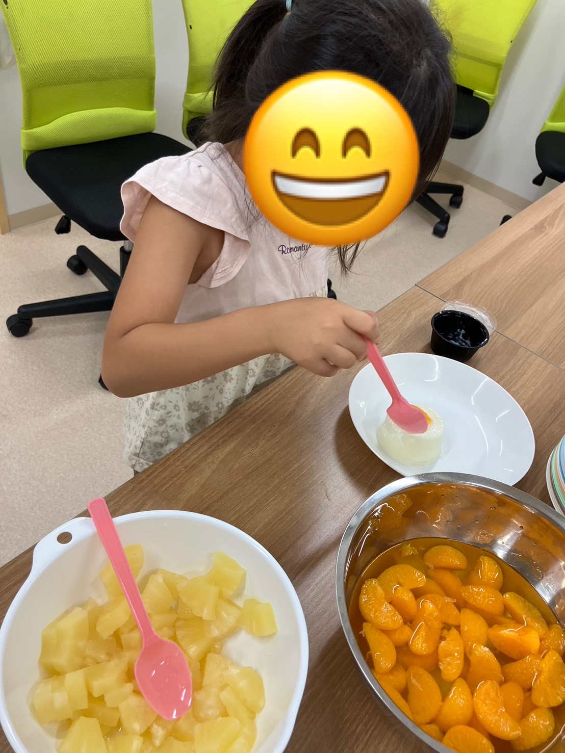 午後からはいよいよみんなで楽しく食べる時間です!トッピングのみかんとパイナップルを準備して、好きなものをのせて美味しくいただきました😋