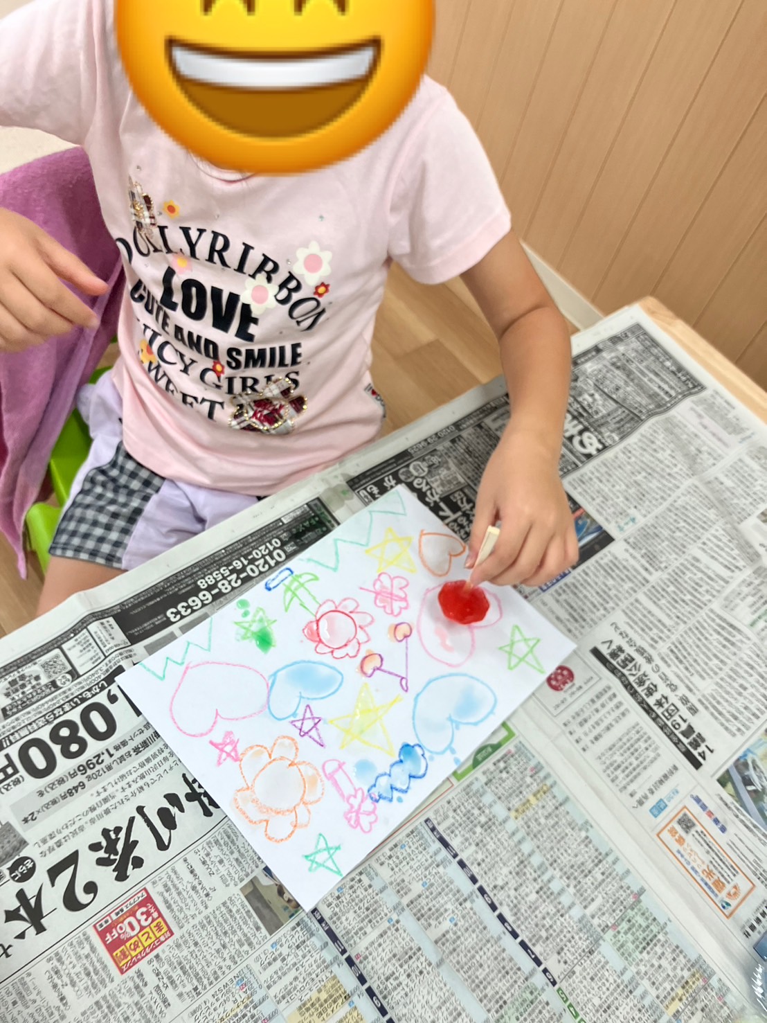 『氷で絵を描こう🧊』では、まず白の画用紙でクレヨンで絵を描き、塗り絵を色つき氷で行いました✏️