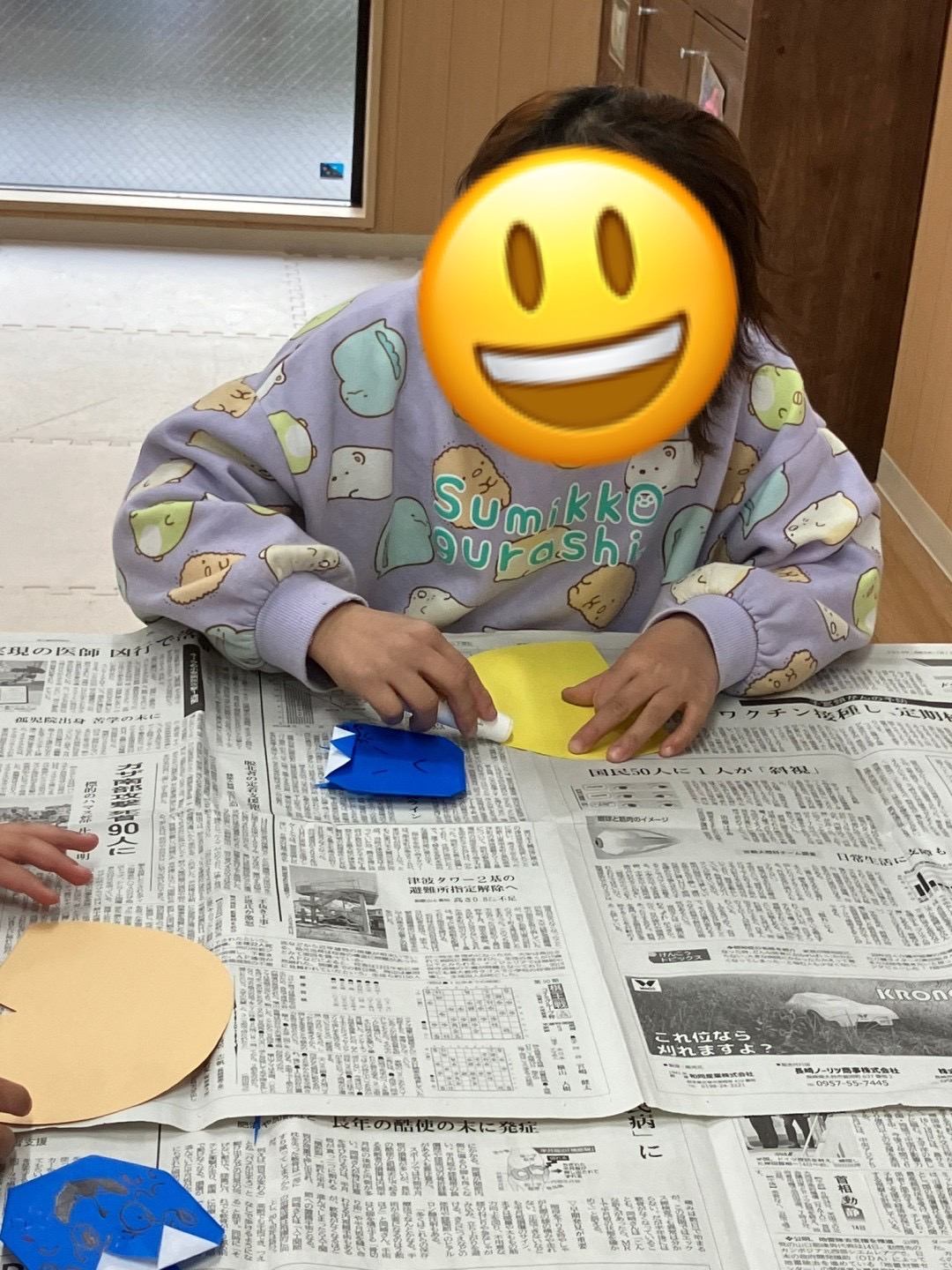 本日の制作活動では、折り紙で節分の鬼を折ったり、折り紙をちぎって鬼のパンツを作ったりしました👹✨