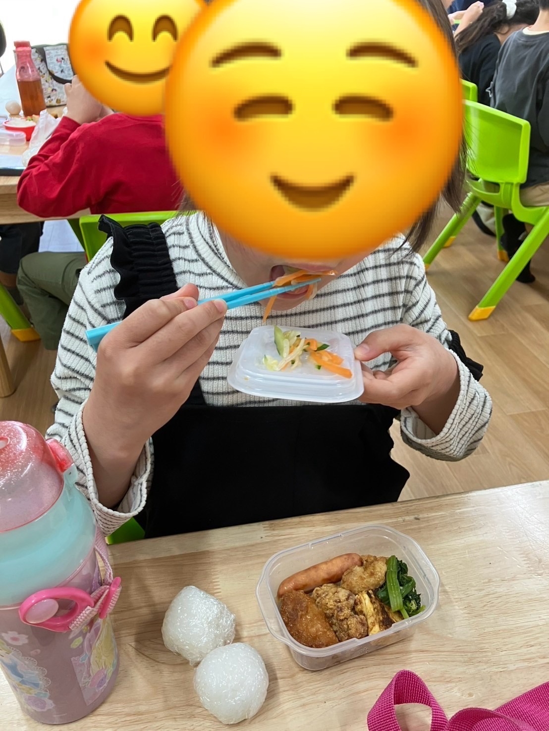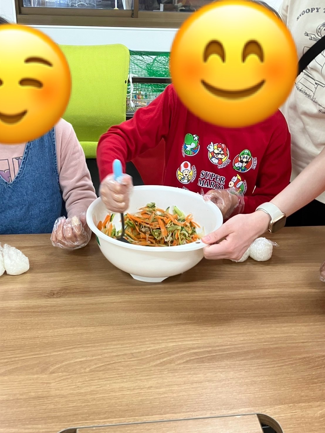 本日の活動はクッキングで「おにぎり🍙を作ろう!」ということで、ラップにご飯🍚をのせて自分で丸めたりして作りました♪ 家庭菜園で作った人参🥕ときゅうり、もやしでサラダ🥗も作ってお昼ご飯の時に、おにぎりに海苔を巻いたりして美味しそうに食べていた子供達でした😊