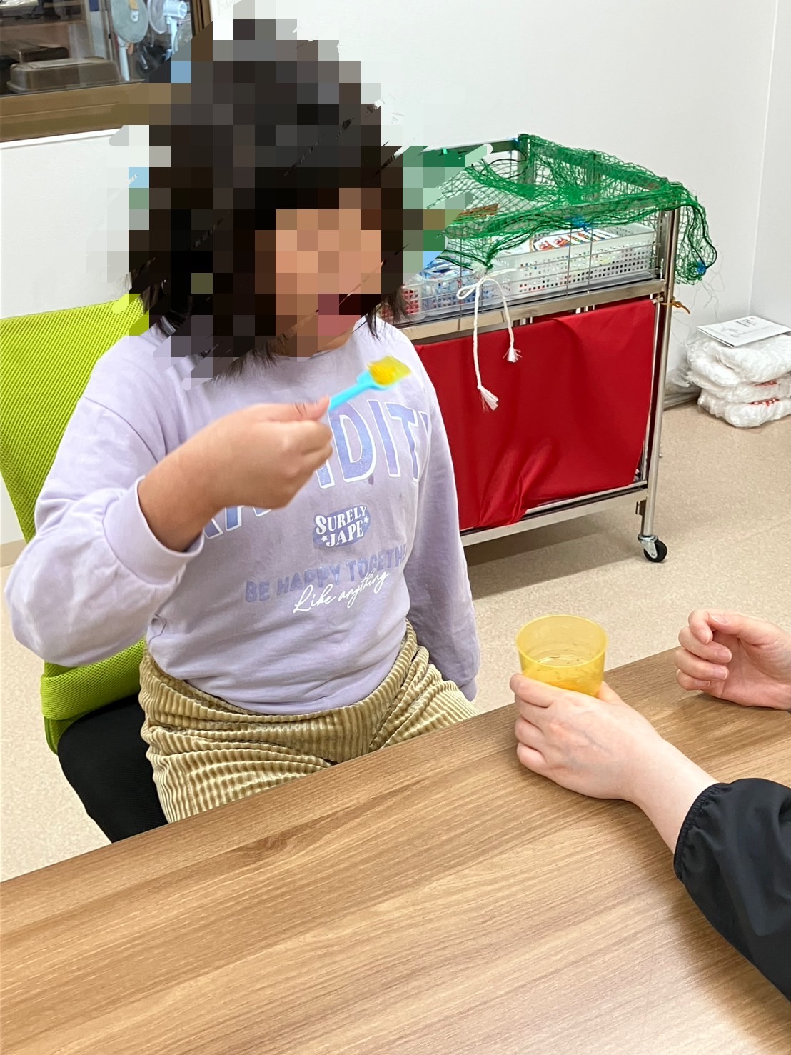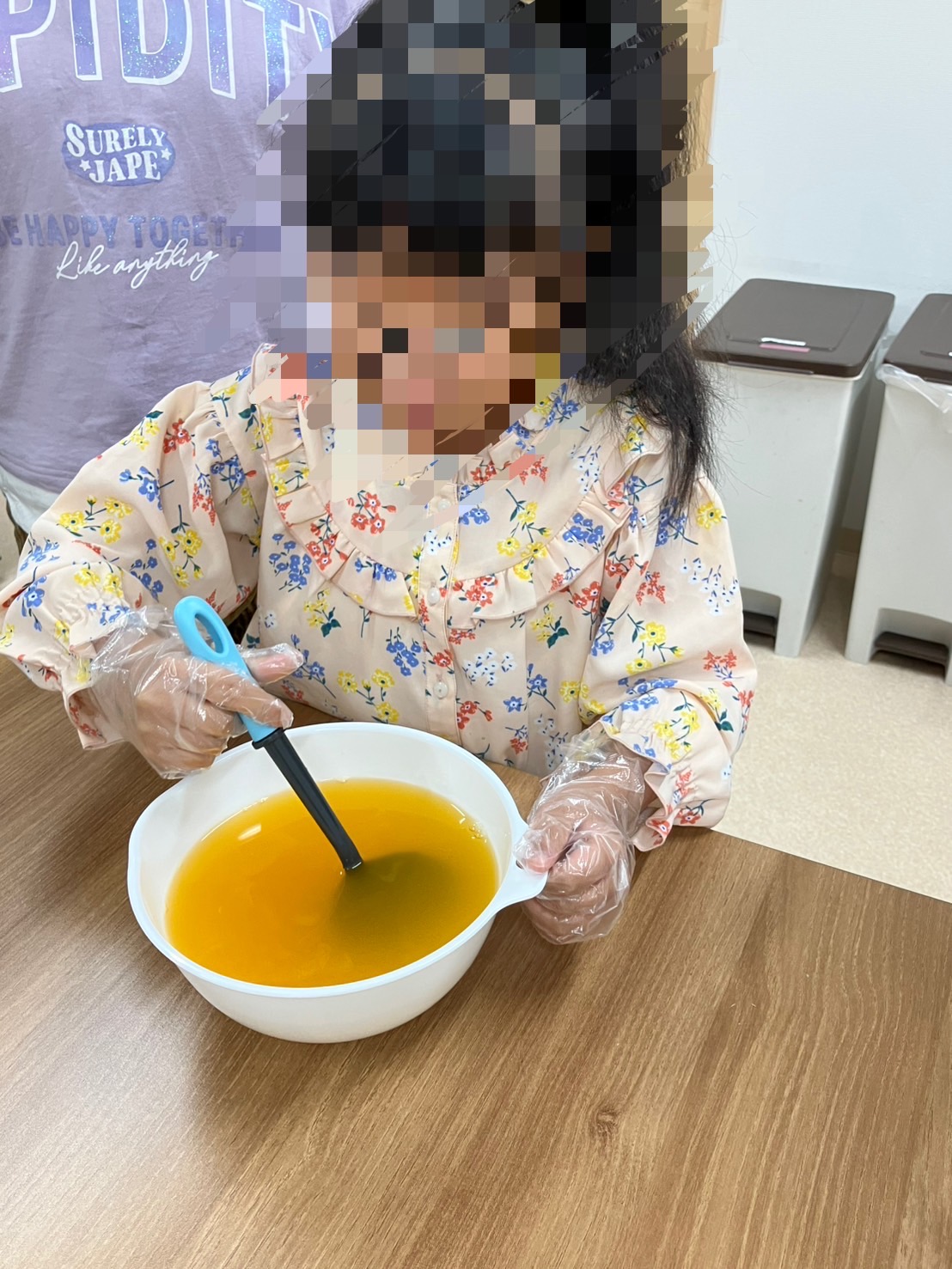 午前中にオレンジジュースにゼラチンを入れて冷蔵庫に入れました😌 お昼には、みんなで確認すると、見事に固まってゼリーを完成させることができました。