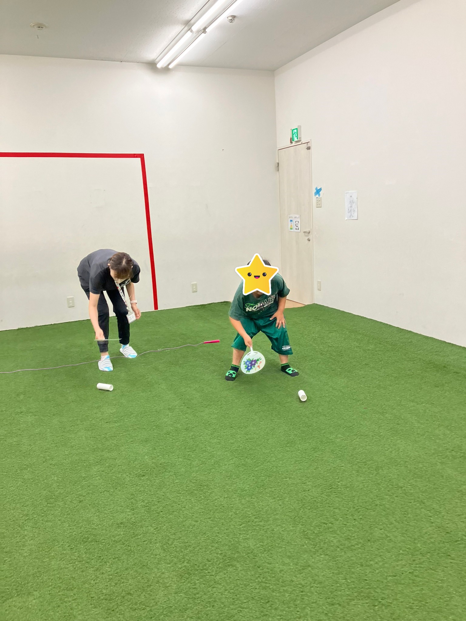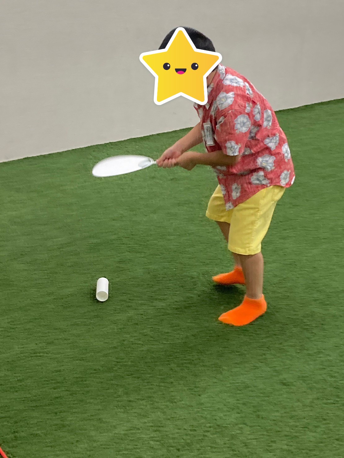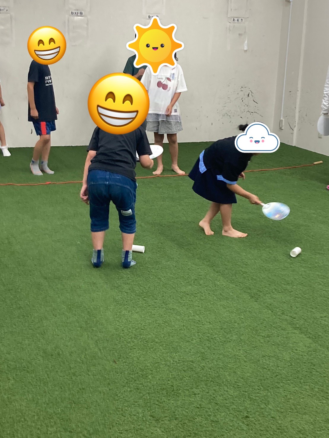 うちわを使ってトイレットペーパーの芯を上手にゴールまで運んでいく事をしています✨