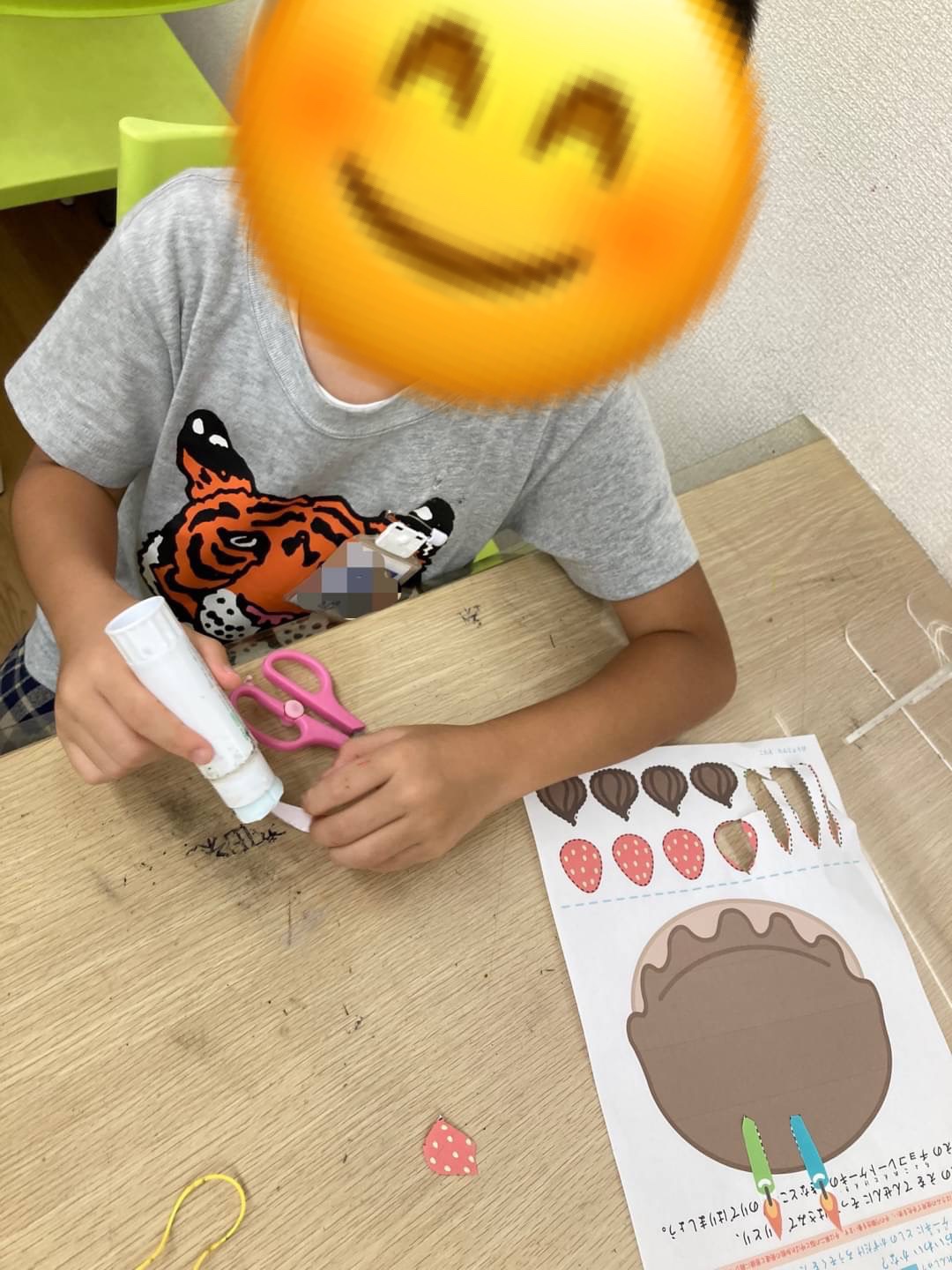 いちごやろうそくなどのイラストをハサミで切り取り、ケーキにのりで貼る作業を行いました!