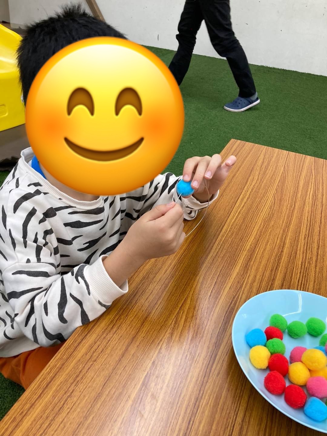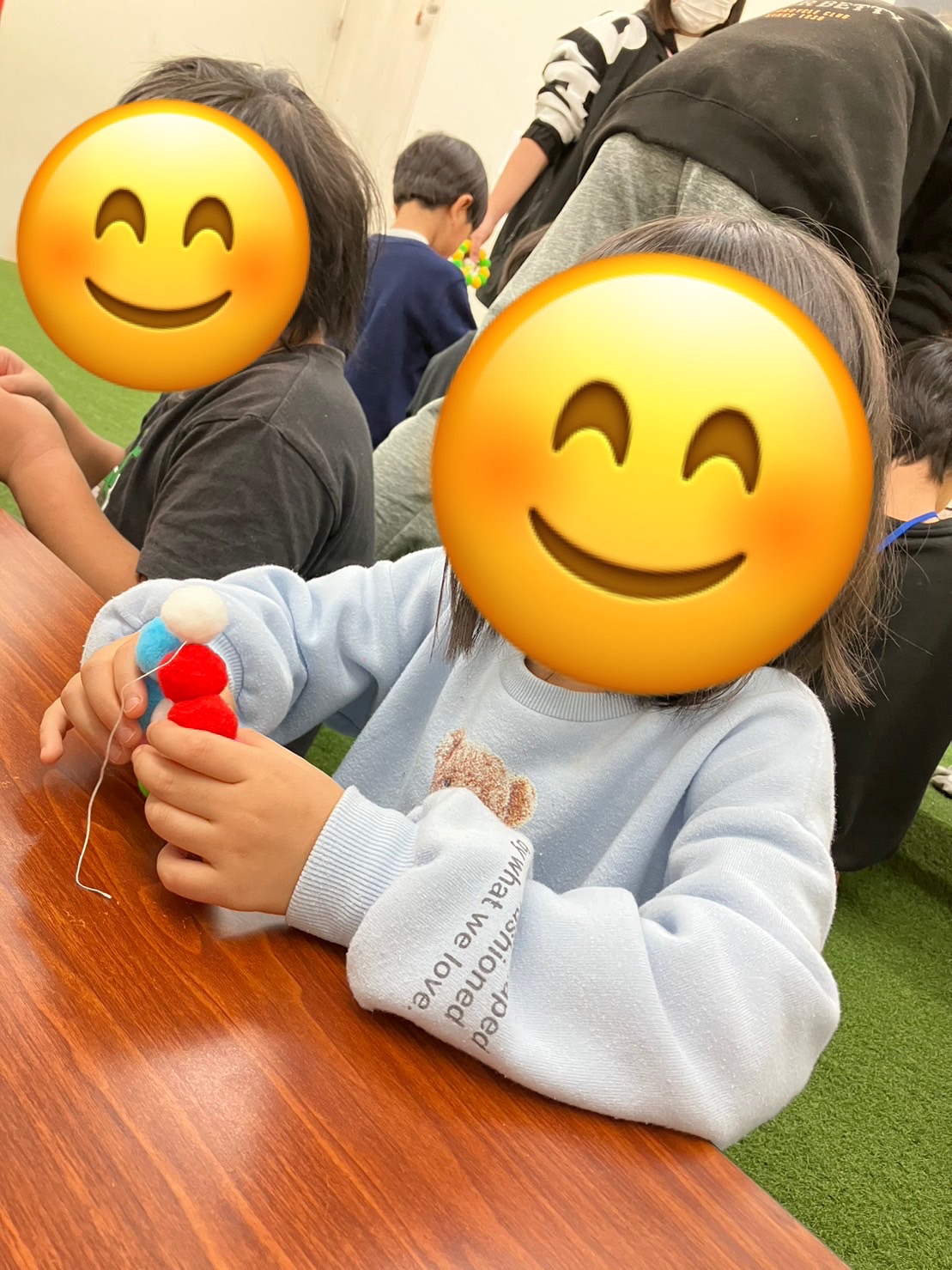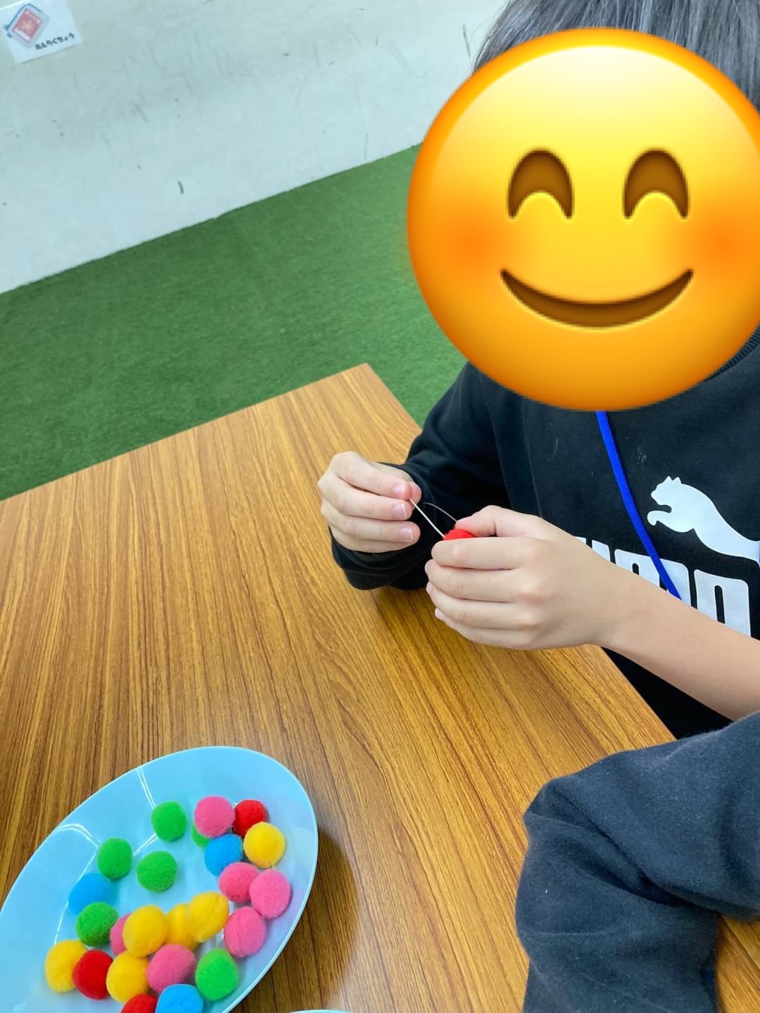 ワイヤーにポンポンを通す作業が少し難しかったですが、職員と一緒に頑張ったり