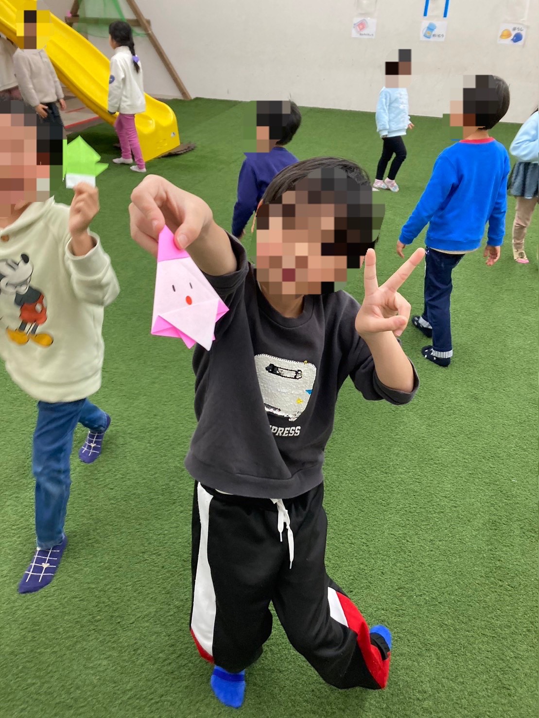 宝探しゲームではお友達と協力しながらみんな頑張って一人一つ見つけ出すことが出来ました。宝探し後はサンタさんが登場しクリスマスプレゼントをもらいました🎁