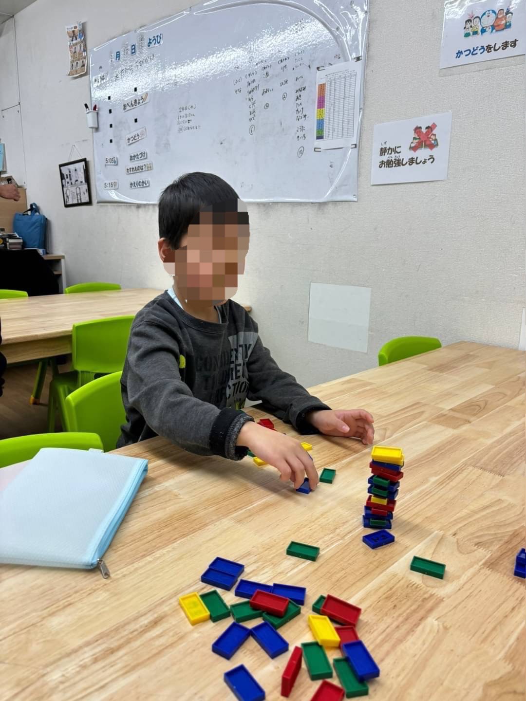 ミニゲームでは積み木タワーを崩さないように真剣に組み立てていました!