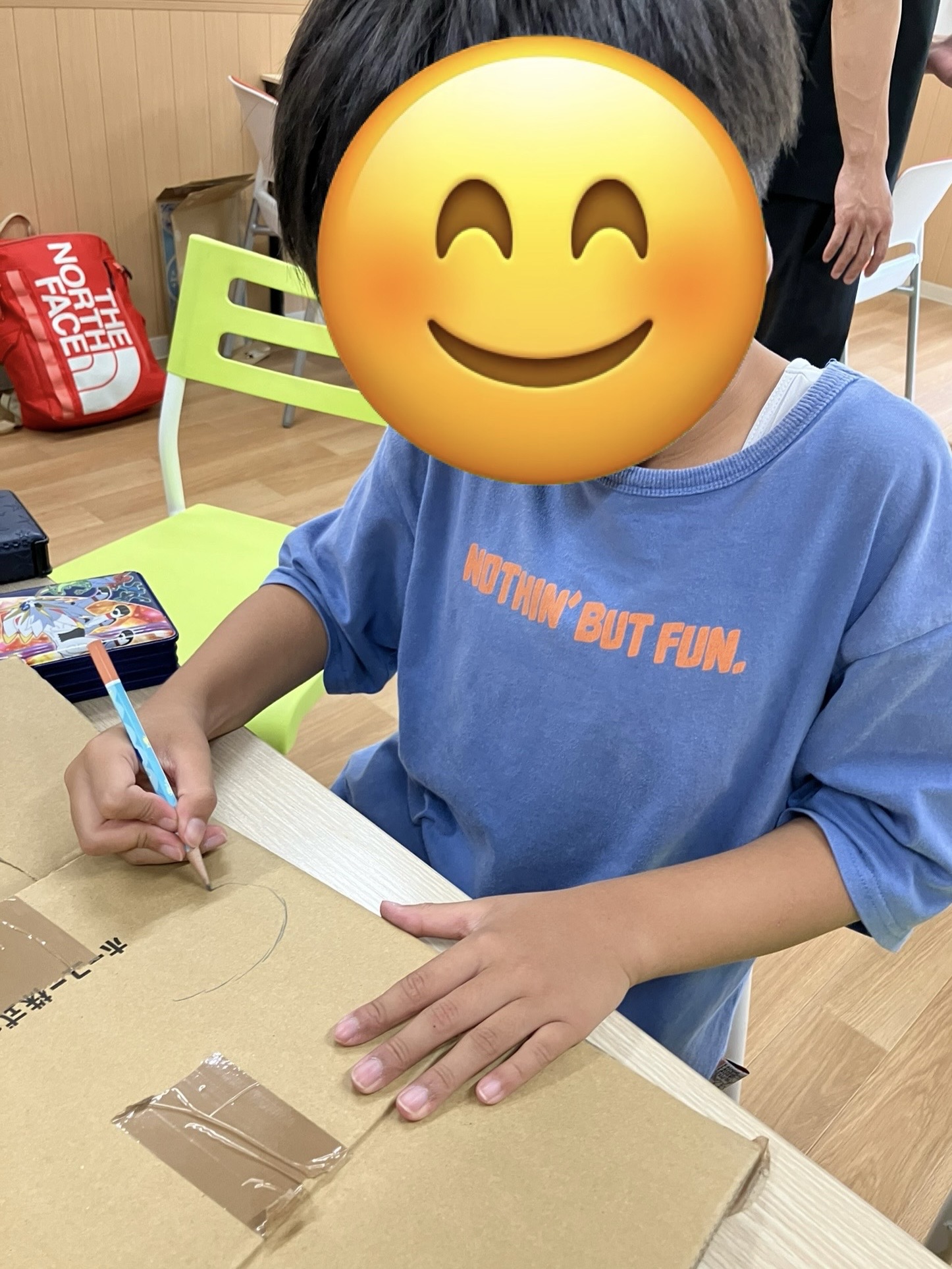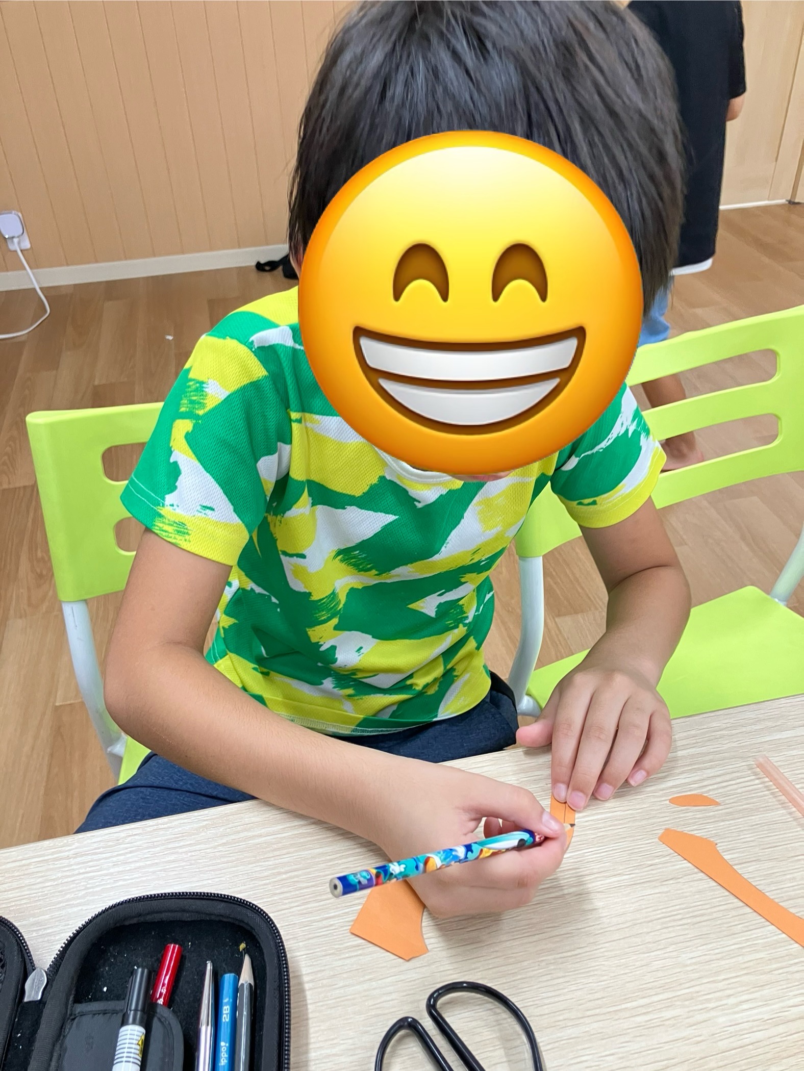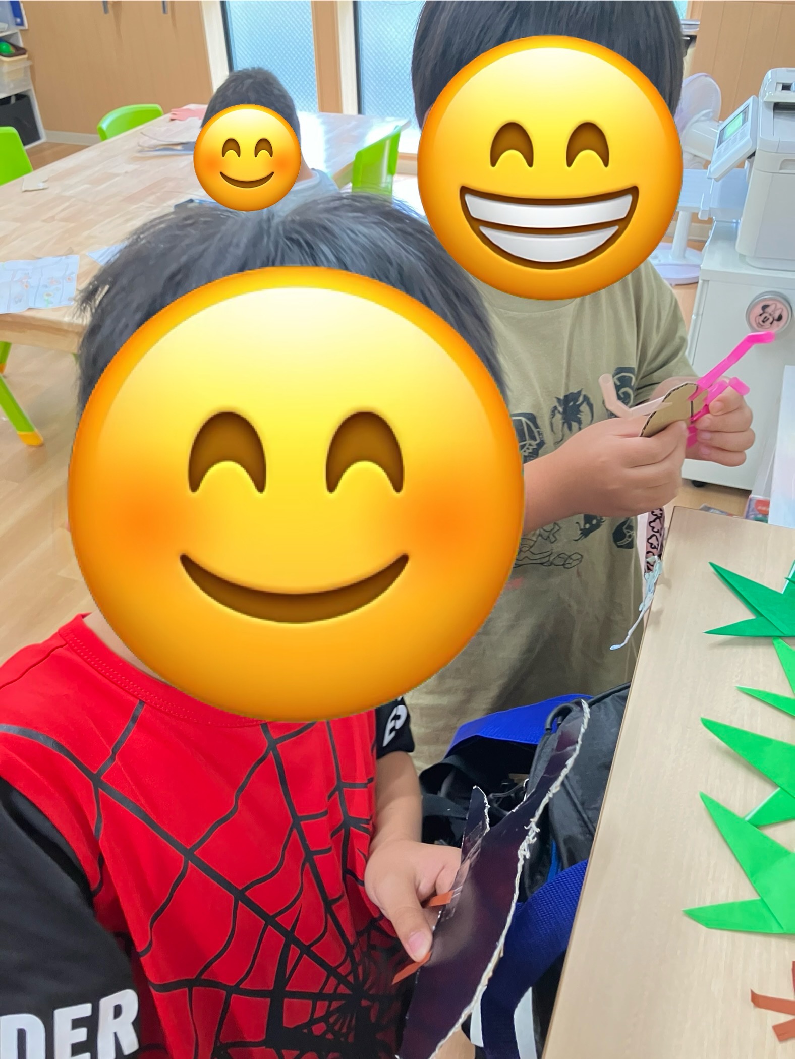 最初は夏の虫をイメージするところから始まり、何を作るか悩む姿が見られましたが、作るものが決まると、ダンボールや色画用紙を素材としながら、ハサミやテープを使って楽しく活動に取り組む事が出来ました✨