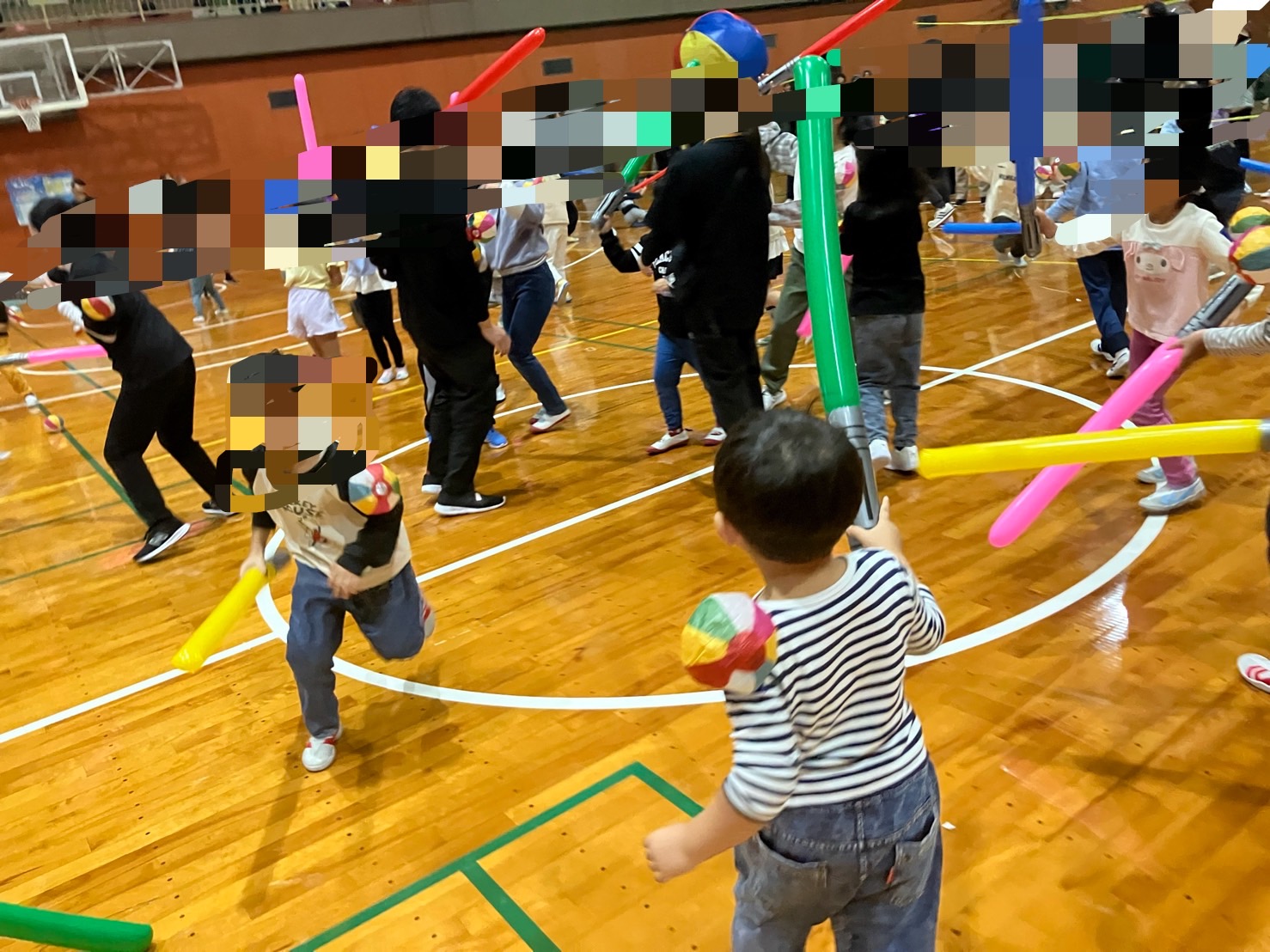 チャンバラ合戦や大風船運びでは各事業所の児童が協力しながら思い切り楽しむ姿が見られ、