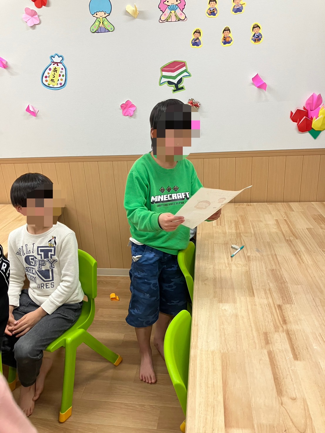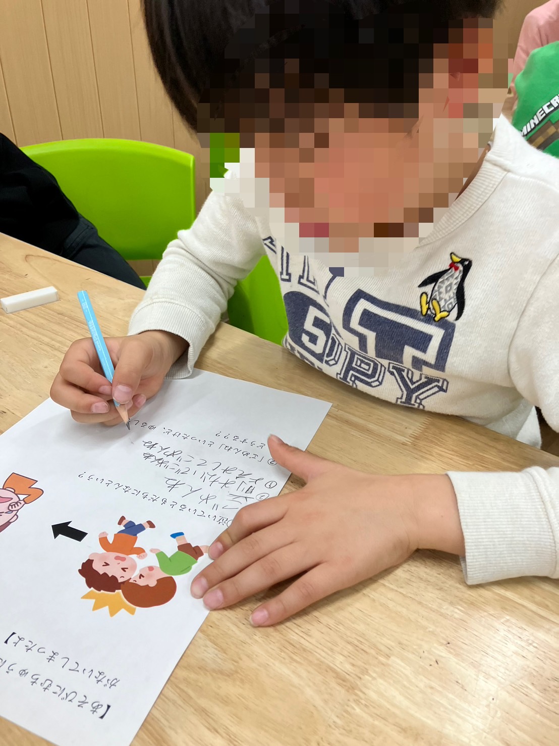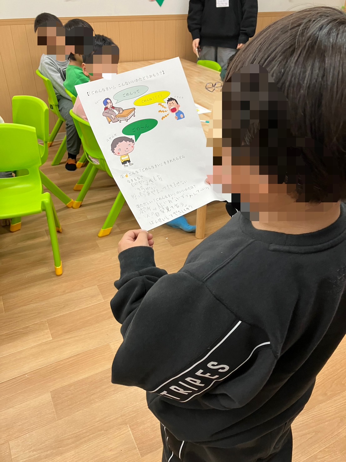 お部屋で起きている実例をもとに、それぞれの立場から気持ちを考えたり、どういう行動をとった方が良いのか友達と意見を出し合ってを考えました🌝