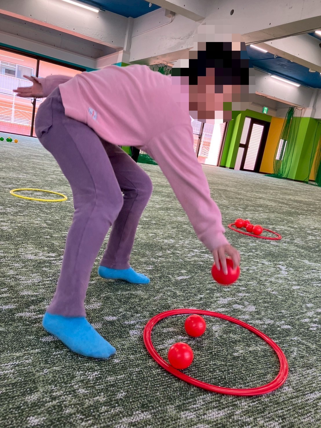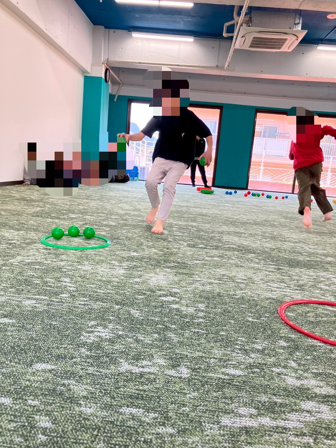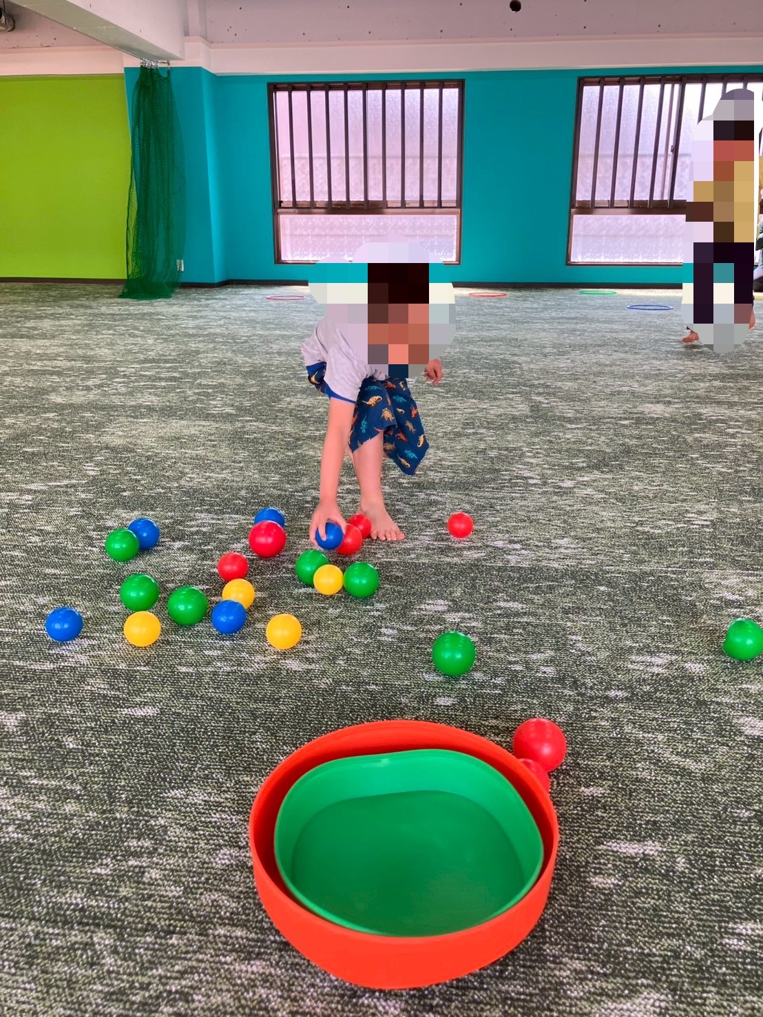 「カラーボールで遊ぼう」と題して、自分の決められた色を向かい側にあるカラーフープの中まで入れに行くという、自分の色を覚える記憶力・ボールとフープを往復する体力・ボールをフープに入れる時の力加減・たくさんのボールのなかから探す目の体操といった四つの点を重視する活動でした🍀