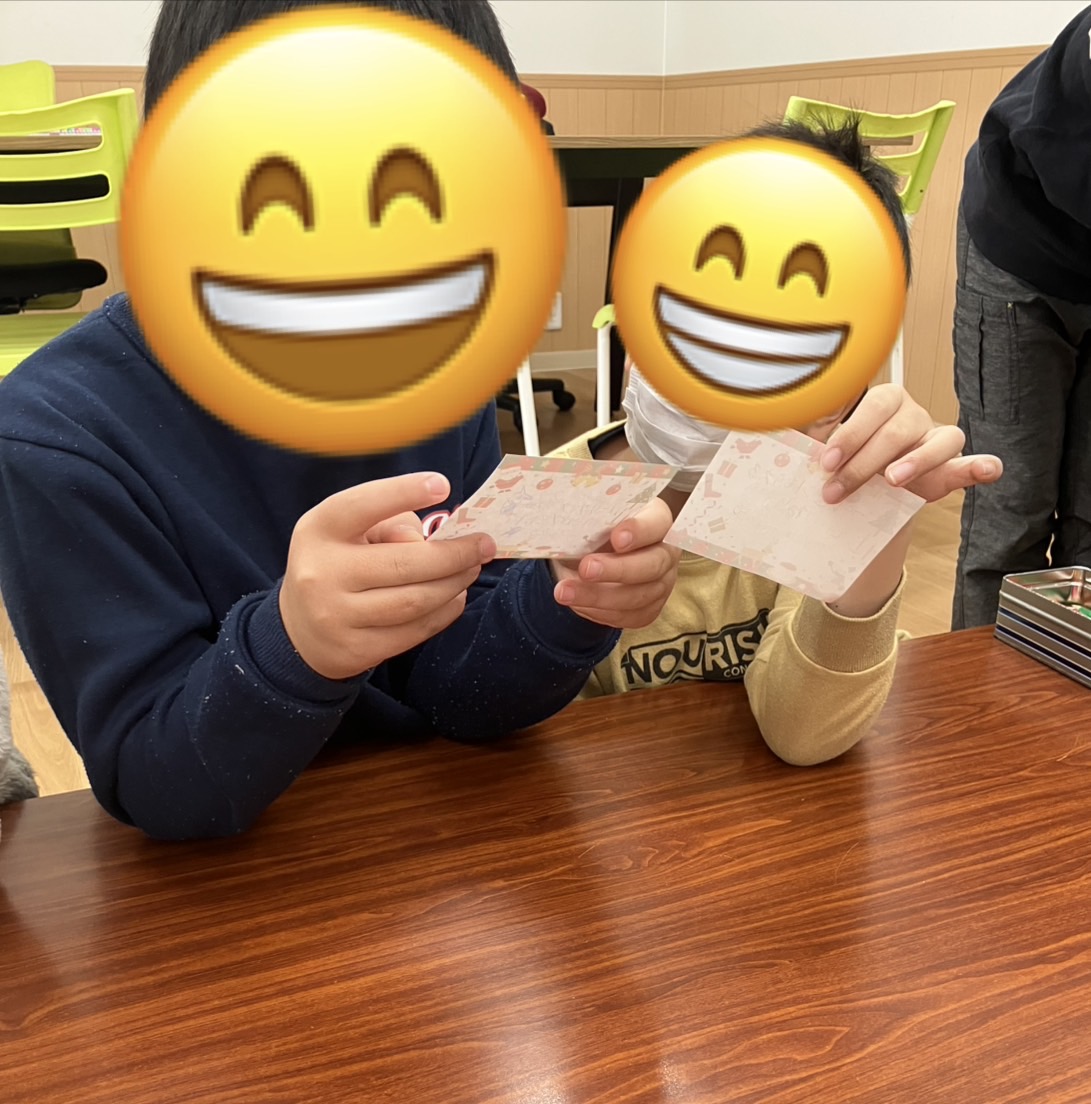 朝の時間は、みんなでメッセージカードに素敵な言葉を書いてプレゼント作りを行いました。