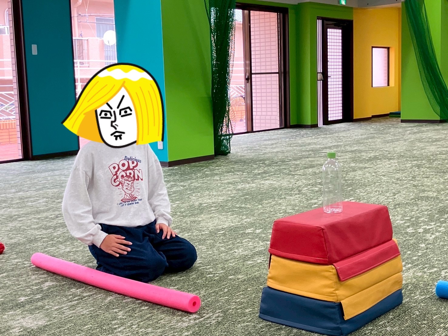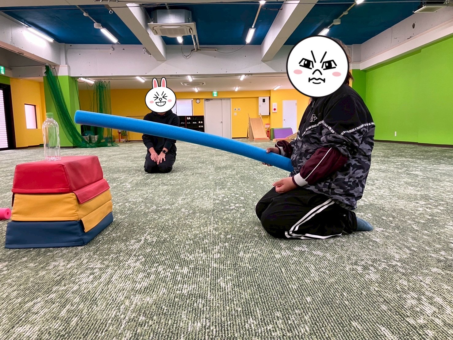 スポンジ刀をもって音が聞こえたら目の前のペットボトルを切りました🗡️