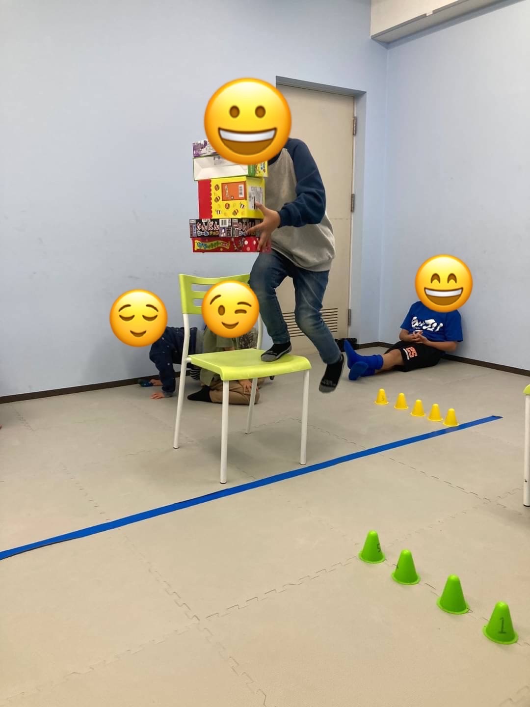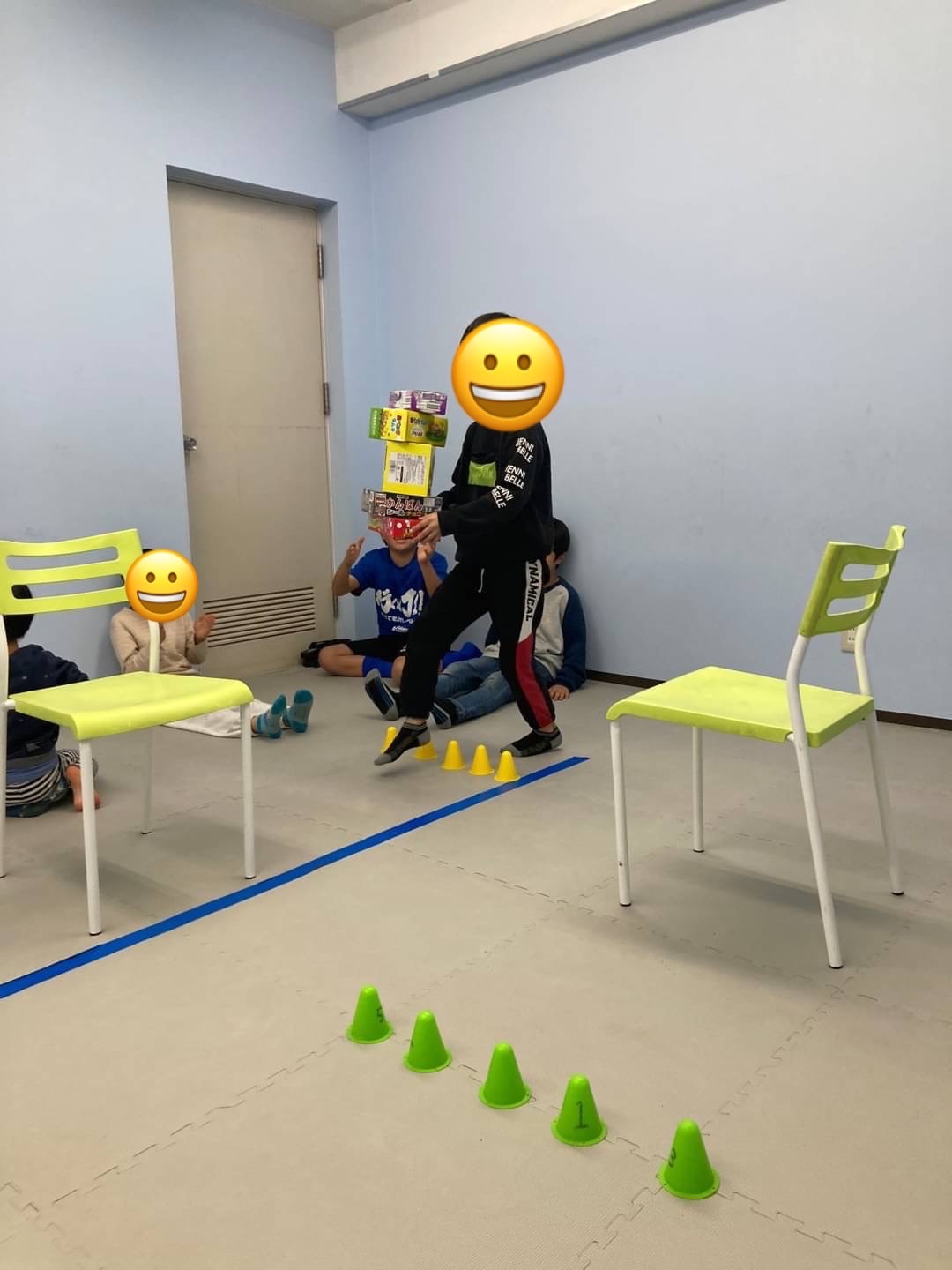 積み重ねた箱を崩さないように持って、色んな障害物をよけたり、登ったりしてタイムをはかりました😊