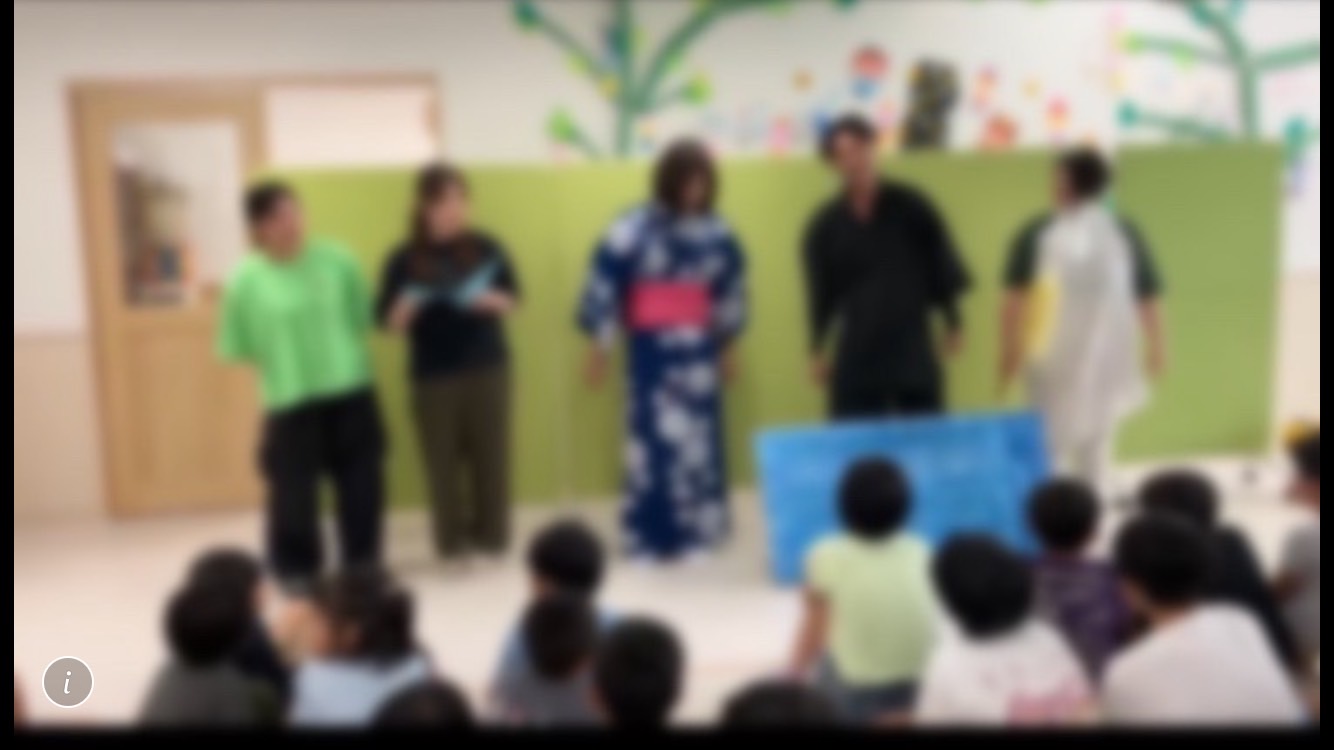 全児童で七夕オペレッタの「たなばたさま」を見ました。役に演じきる職員を見て目を輝かせる児童や