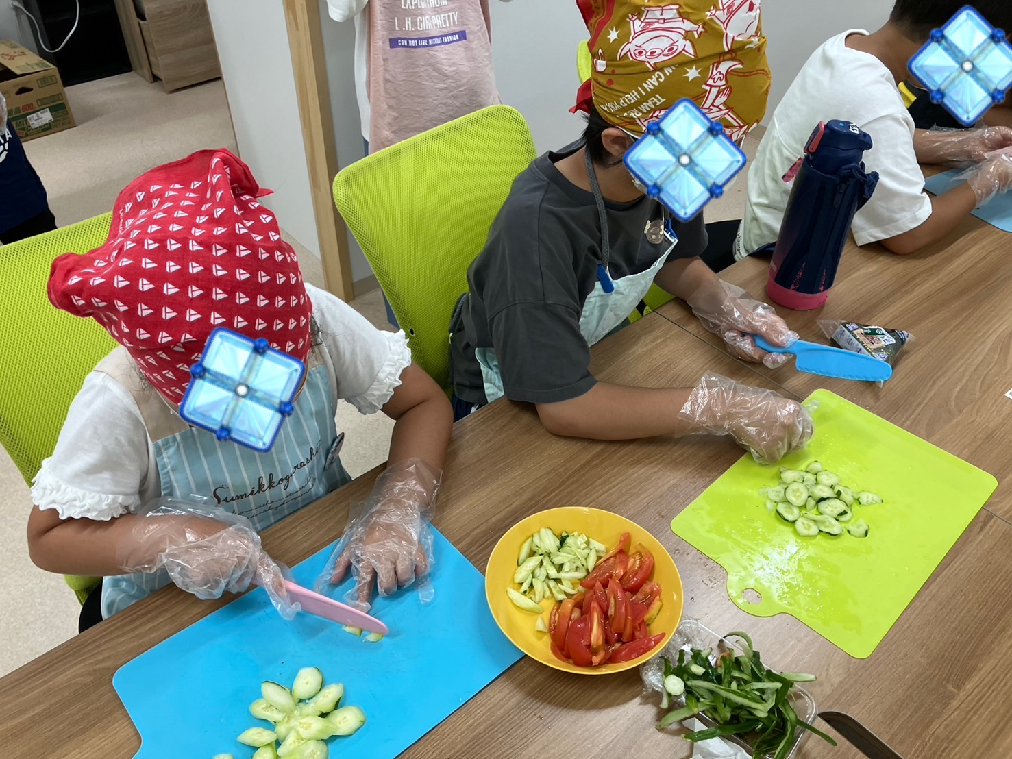 クッキングが初めての体験の児童や、切りにくいトマト🍅に苦戦しながらも1班は完遂✨